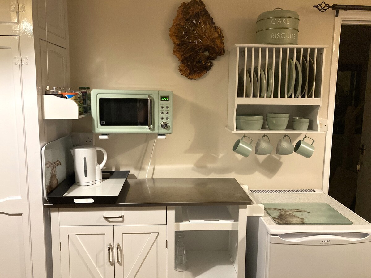 The front door opens into the large fully equipped kitchen,with high level double electric oven, five burner gas hob,dishwasher, microwave and window to the front of the property. Leading to; the living room with plenty of seating, decorative fire and smart TV, front facing window, frosted window to the back and large bay window to the side. The property has a washing machine, 2 airers, iron and board. There is also a side door from the parking area and courtyard leading into a large storage hall and through to the kitchen.