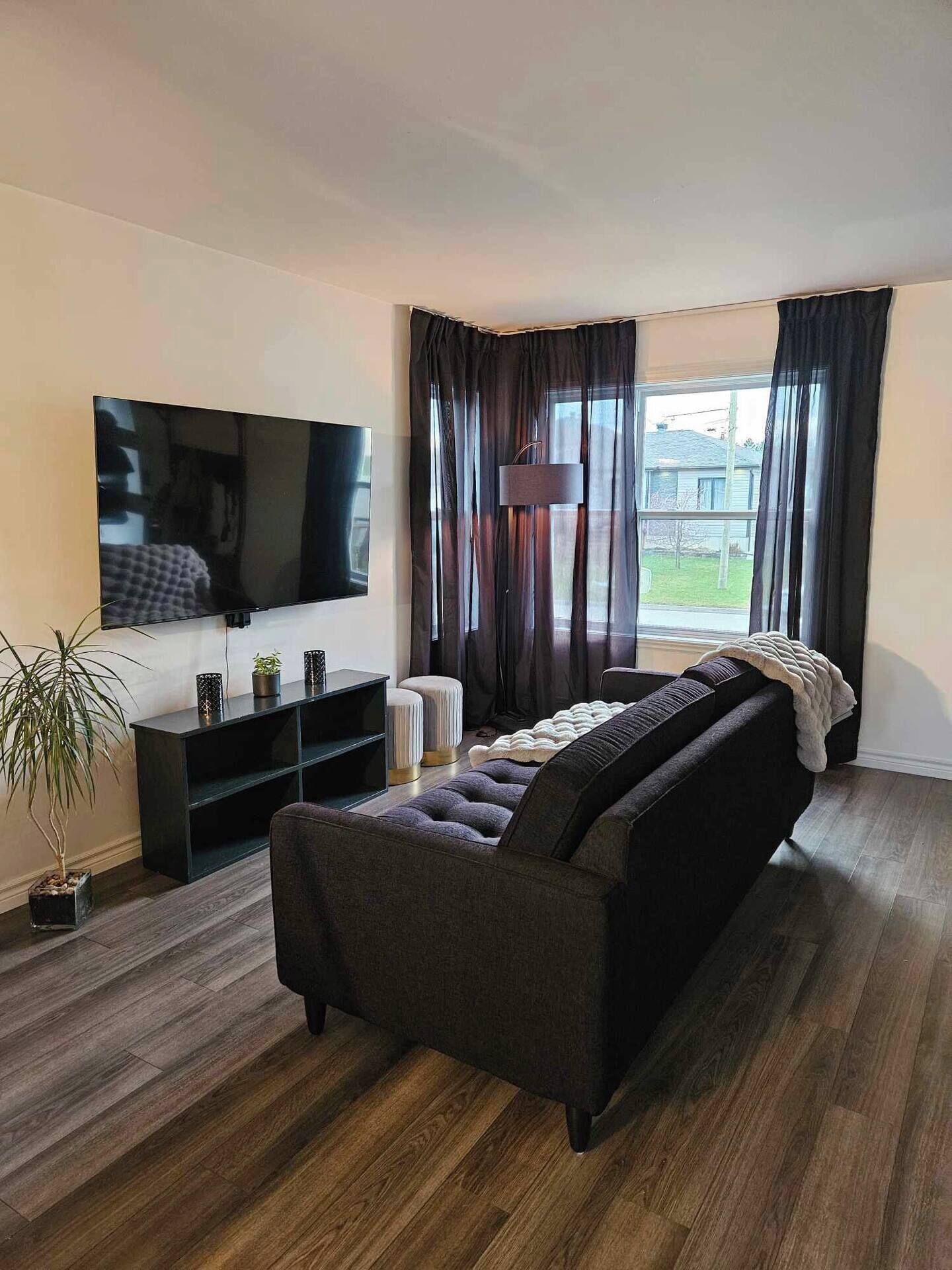 Elevate your guest experience by staying at this fully renovated two-bedroom along with bathroom second-floor apartment. Two sinks in the bathroom will offer your group convenience, while the living room foldout couch will enable extra guests to sleep comfortably. Centrally located in the downtown core of Sherbrooke City, you will have free parking, walking distance to all local amenities, and excellent customer service to support you in every way.