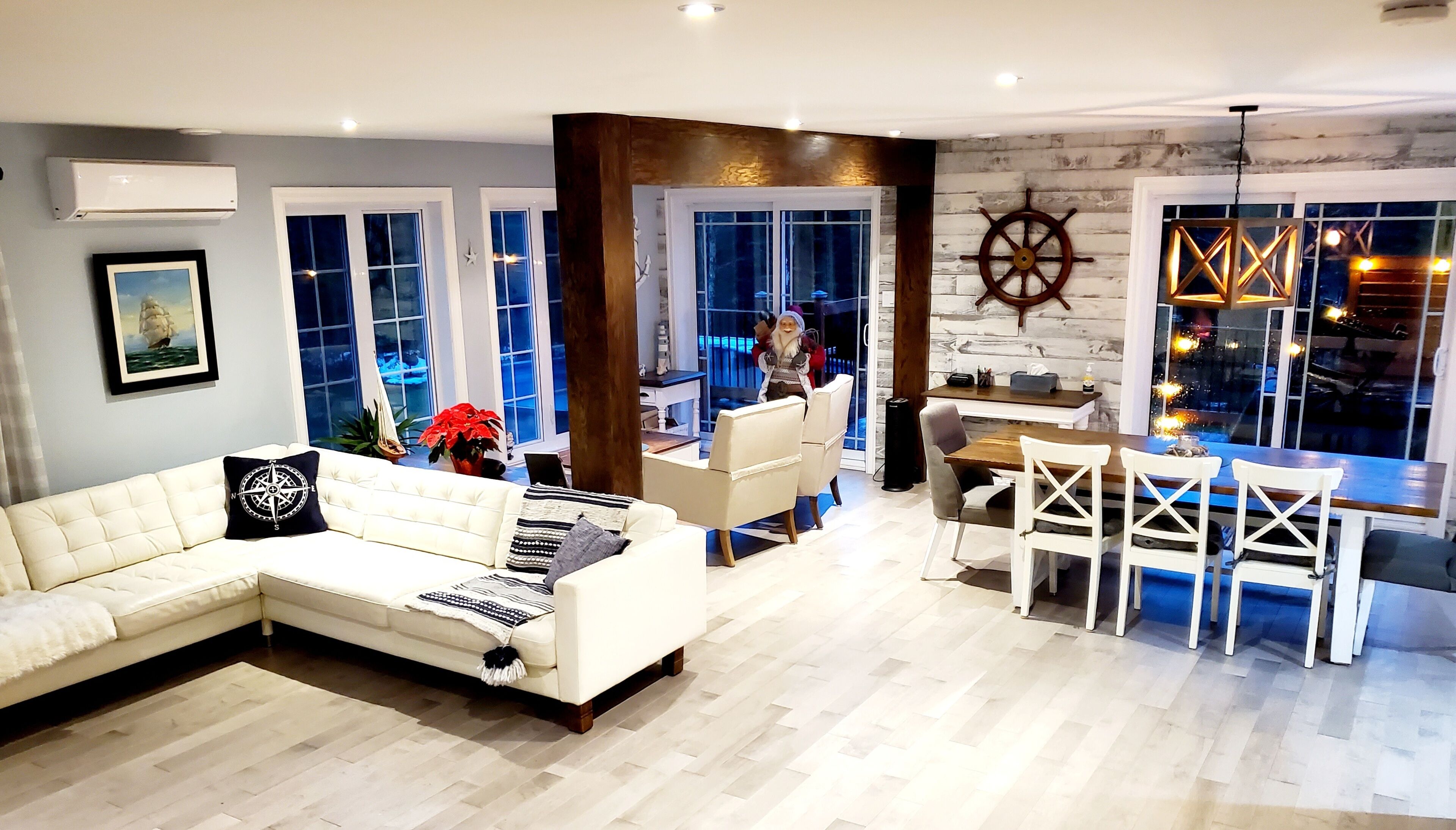 Chambre lit queen TV, sofa lit queen au sous-sol TV et petit coin mezzanine qui peux accueillir les enfants a dormir.