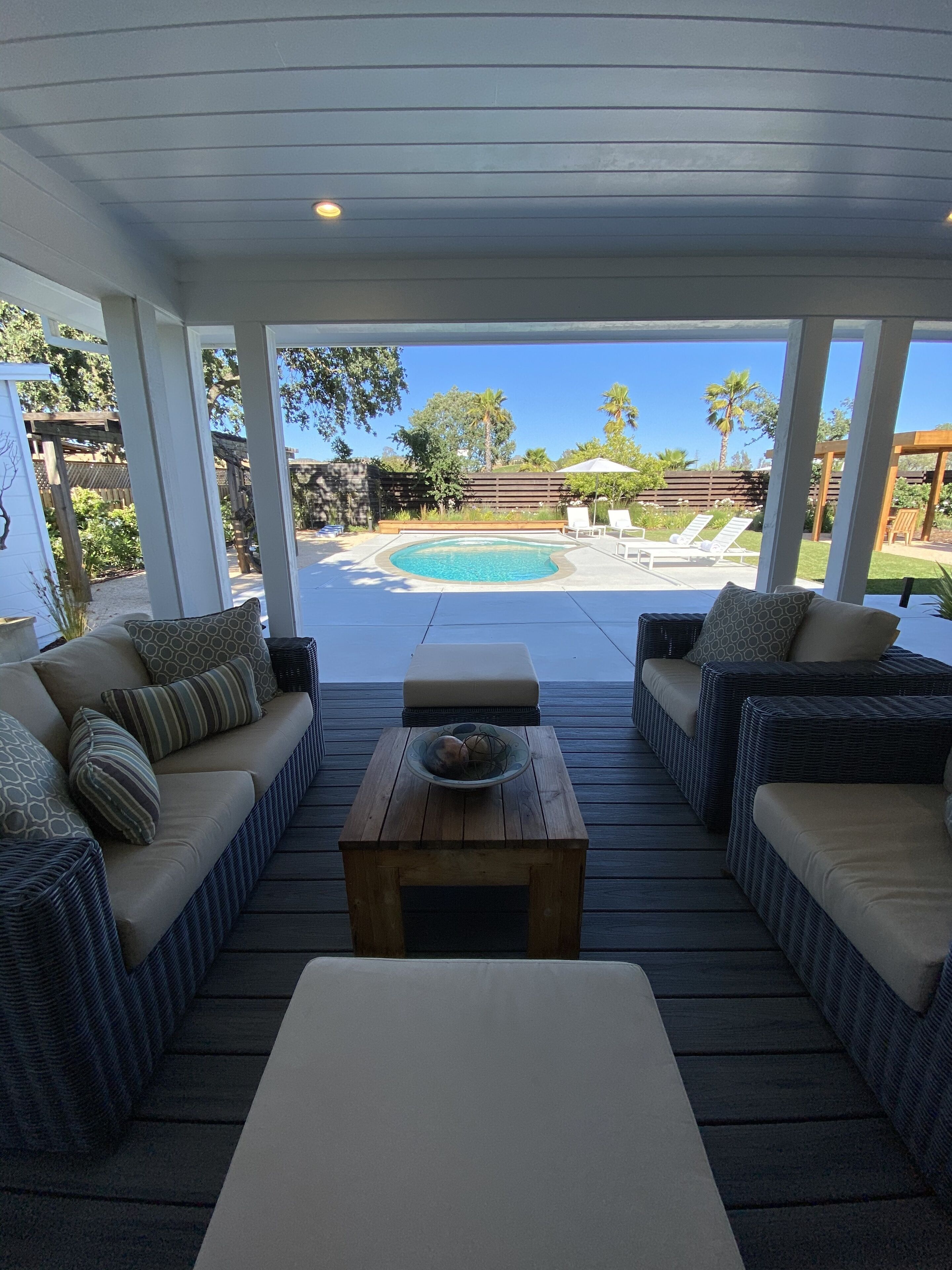 The back patio has oak trees and very comfortable sectionals for relaxing and having a glass of wine. The breakfast/dining table on the back deck is perfect for that morning cup of coffee or planning your day.