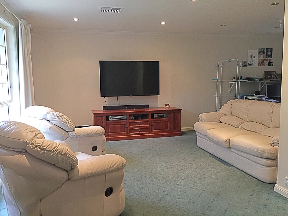Welcome to access and use the lounge room with wall mounted 60” Smart TV situated at the front of the house adjacent to the master bedroom. This can be pretty much your own domain as there is a separate family room with TV in the home.