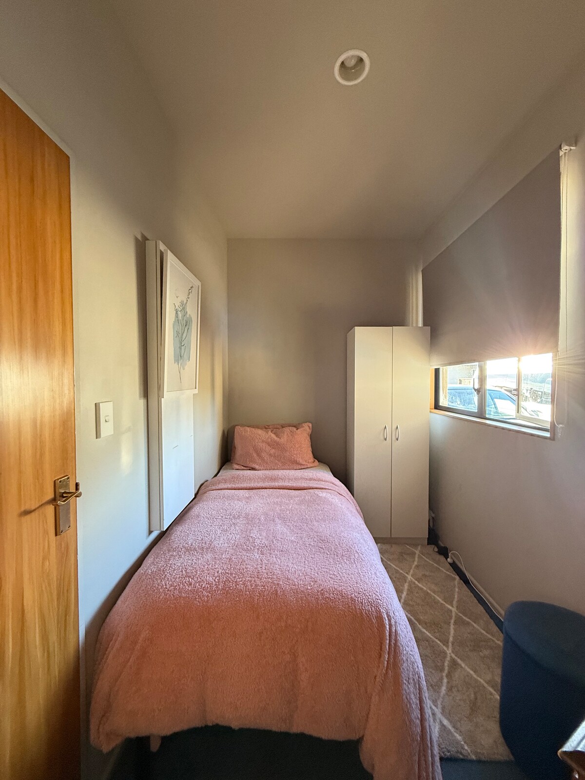Room with a single bed, with a simple working bench and chair facing sunny residential view.
