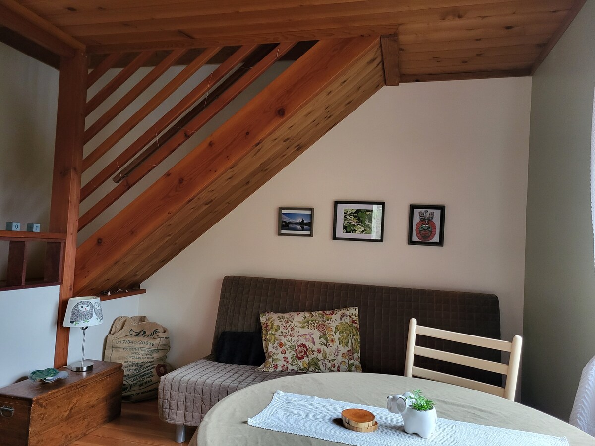 Decorated with unique artwork that reflects a love of travel, the open concept guest room features a queen bed, a double sofa-bed, dining set and attached bathroom with a clawfoot tub and shower, plus breakfast station (mini fridge, kettle, French press, coffee, tea, dishes, cutlery, cutting board, knife). My homemade granola and milk are provided on your first morning.