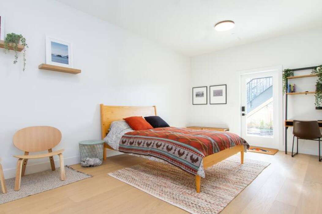 Fully equipped kitchen and you'll have your own washer and dryer. There is a sizeable bedroom with large closet and desk nook. Sizeable full bathroom with shower only and ecotex towels. The bedroom includes a queen Douglas bed with cotton and flax linen sheets and duvet cover with down duvet.