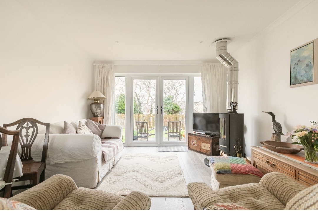 The annexe is attached to the left hand side of our family home (whole home shown in photo for perspective) and you have a path that leads around the back to enter through the double doors to the living room.