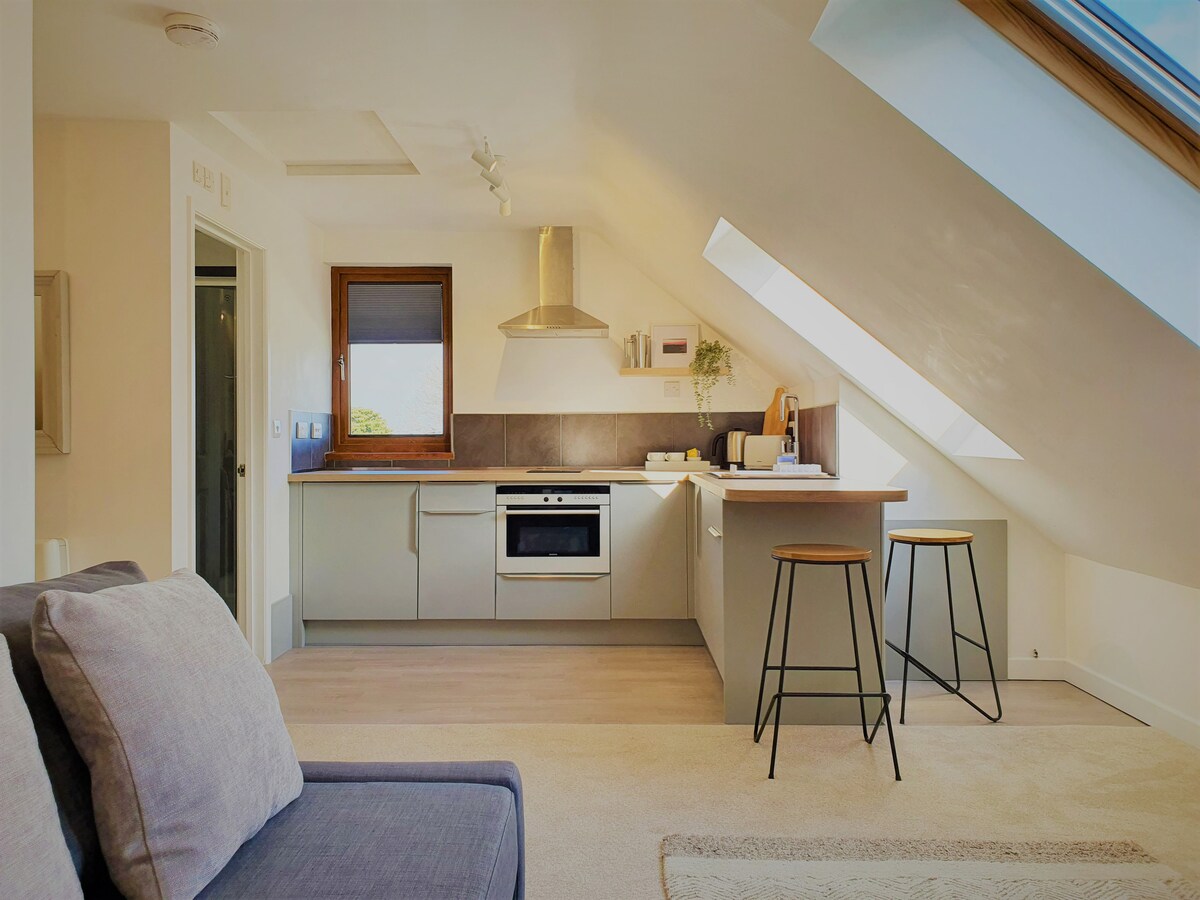 The Studio is open plan with a corner snug area with a double bed, a lounge area with corner sofa which can be made into a bed and a kitchen. A separate shower room with WC and Washer/Dryer for your convenance.