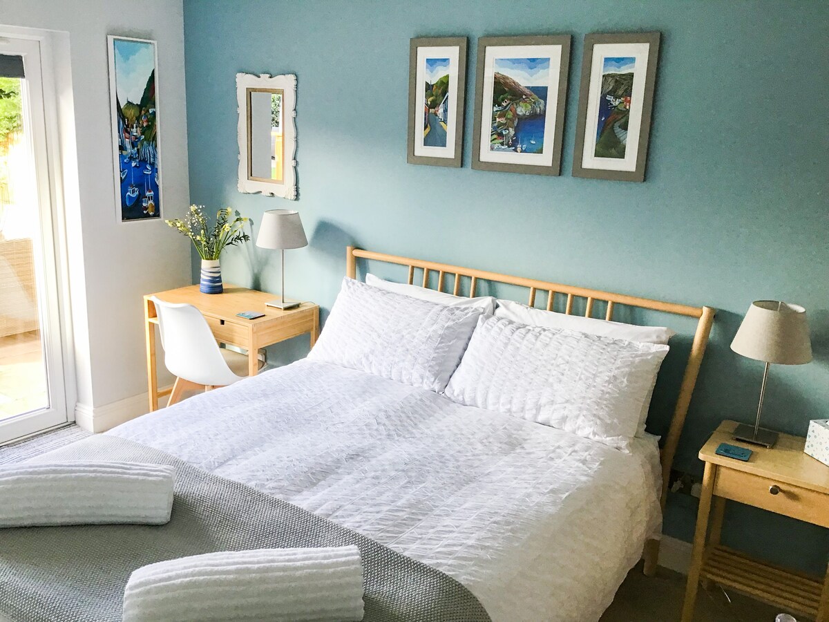 This double room with en-suite and private entrance, is suitable for couples and single guests. There is a desk which can be used as a workspace, and French doors to the garden which make the room light and airy. Outside there is a screened patio space with table and chairs, and storage for walking and wet weather gear. Our bungalow Penrose has a modern, coastal feel which reflects our love of Cornwall, and is located in a quiet residential area just 10 minutes’ walk from St Agnes village.