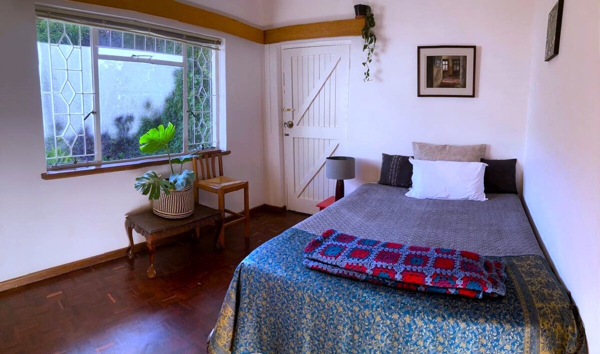 Come stay in our family home, which has lots of space inside and out. The room has a queen-sized bed and has a dedicated bathroom. There is a natural pool and a braai area that can be used. Feel free to enjoy the garden area to relax as well.
