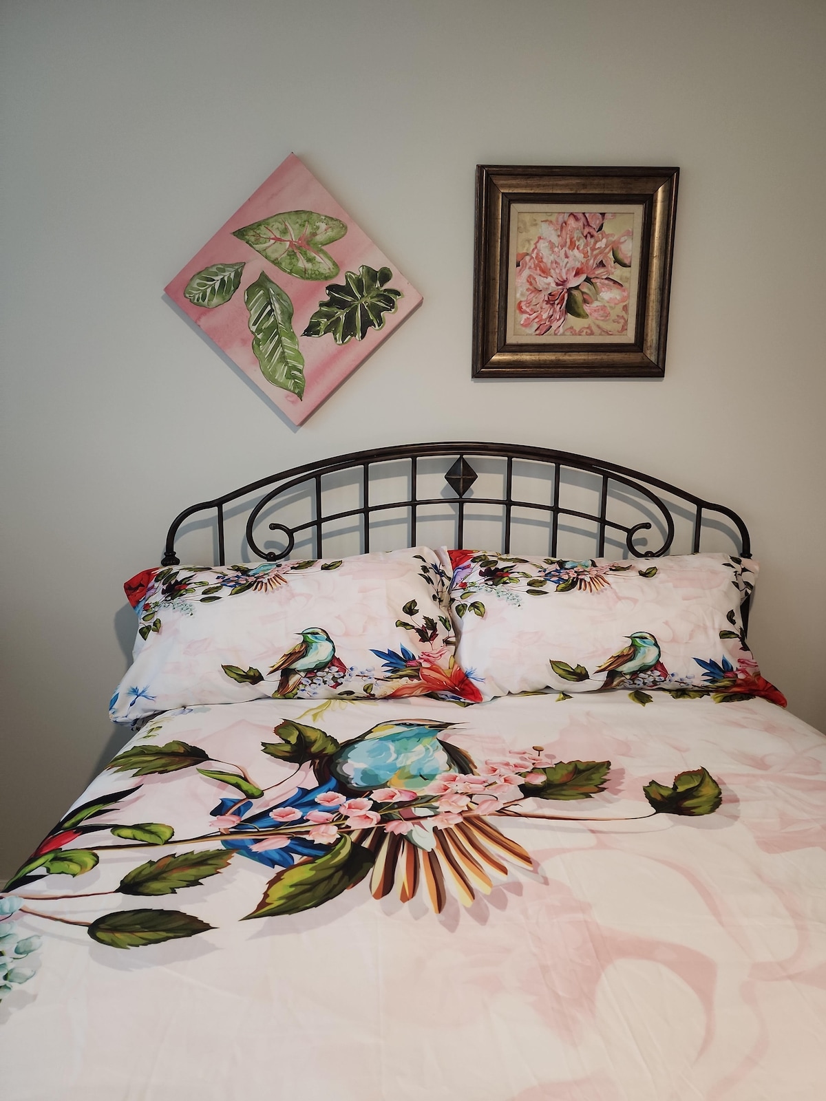 Welcome to your serene getaway! This inviting room features a comfortable queen-sized bed, perfect for relaxing after a day of exploring. Enjoy the convenience of a private in-suite bathroom stocked with essentials. The room is equipped with a smart 42” TV, high-speed Wi-Fi, and blackout motorized curtains. Guests have access to a cozy sitting area with a fully automatic coffee machine. Located in a quiet neighborhood, it’s just minutes away from local attractions and Hwy access.
