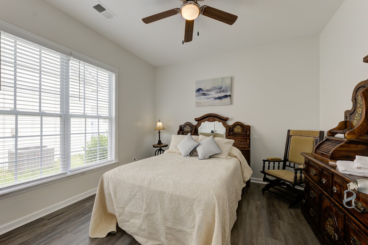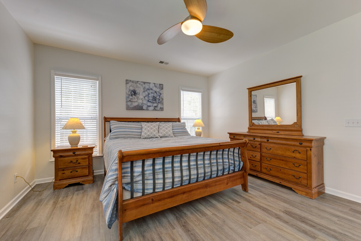 This home, featuring two bedrooms and two and a half bathrooms, is perfect for a relaxing getaway. The main bedroom offers a queen-sized bed, two large regular closets, a nightstand, a chair, two dressers, a mirror, a flat-screen TV, and a ceiling fan. The second bedroom also includes a queen-sized bed, a regular closet, two nightstands, a dresser, and a flat-screen TV. It even boasts an en-suite half bathroom for added convenience.