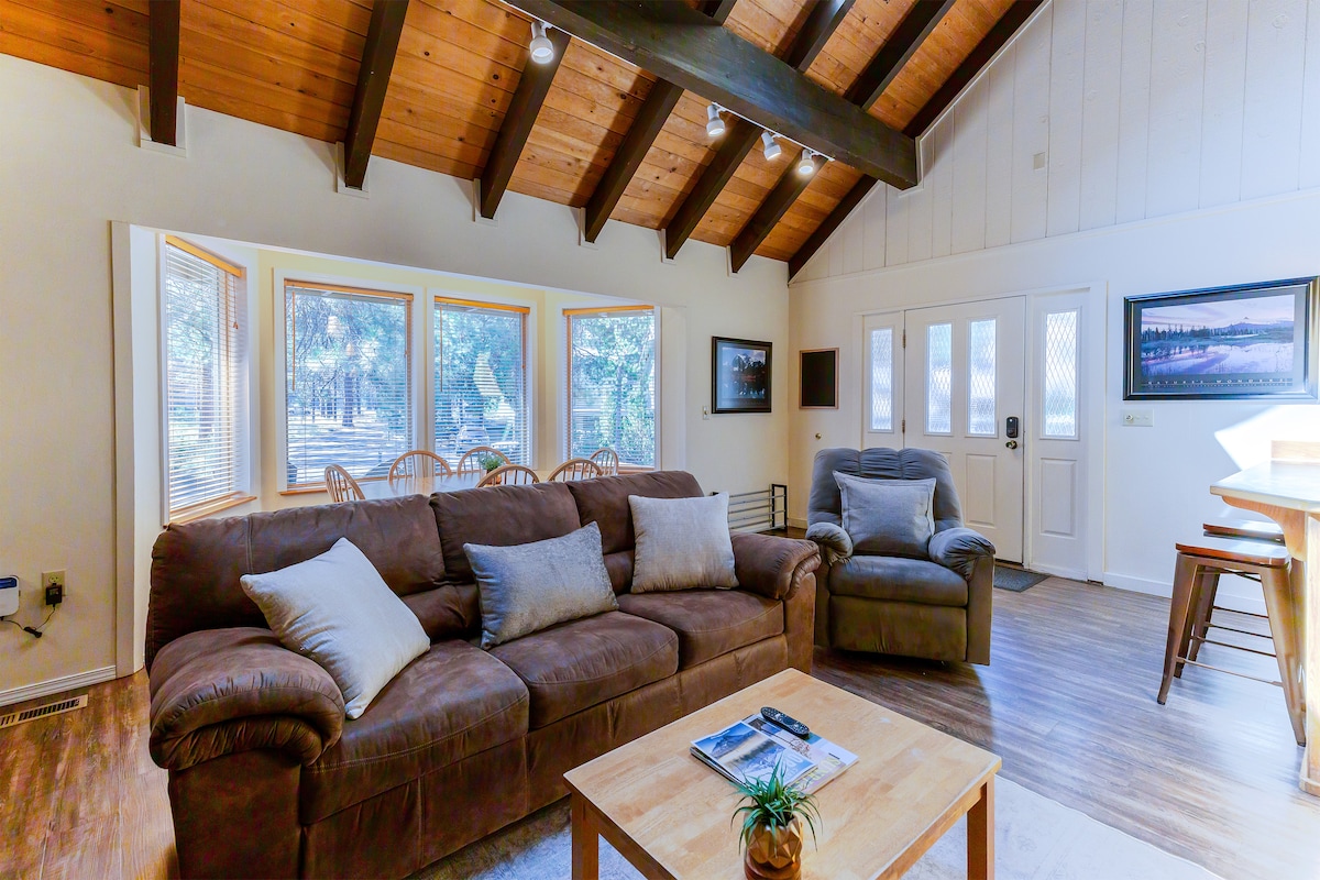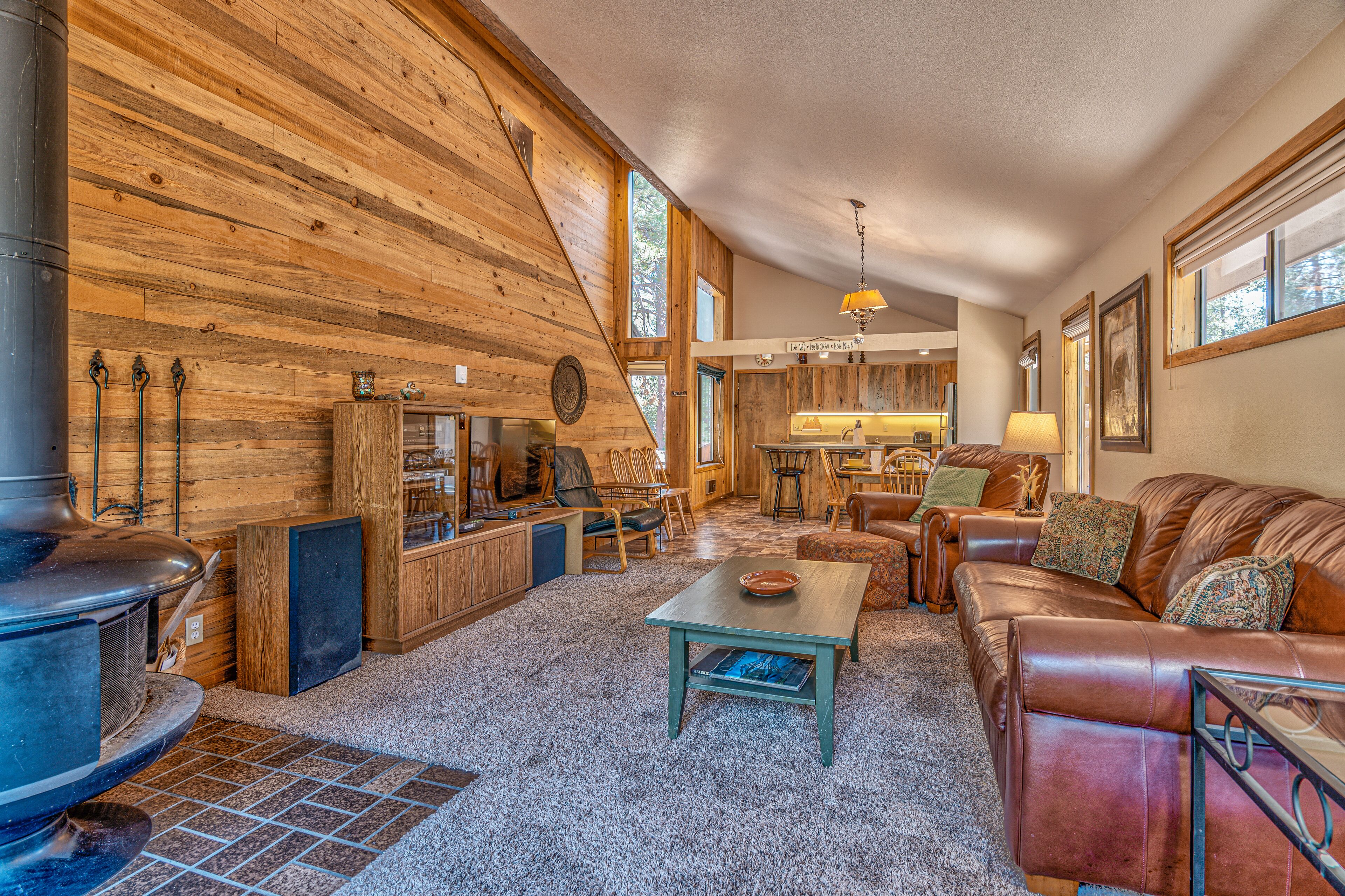 Book your next getaway in this charming cabin near Sunriver, between the Deschutes River and Mount Bachelor! The open living room has lots of windows for filtered woodland light and a large flat-screen TV you can watch from the leather sofa; the wood stove will keep everyone toasty on cool evenings.