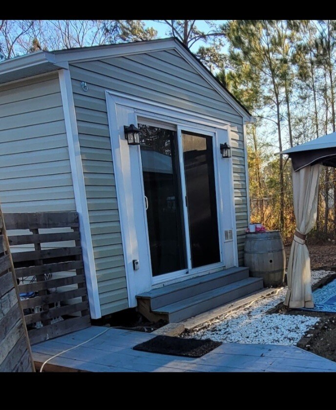 Home is located in our quaint backyard. Two stairs up to the easy sliding door entry. We will meet, I'll show you around, and I'll give you the keys. We have a quaint backyard for relaxing.