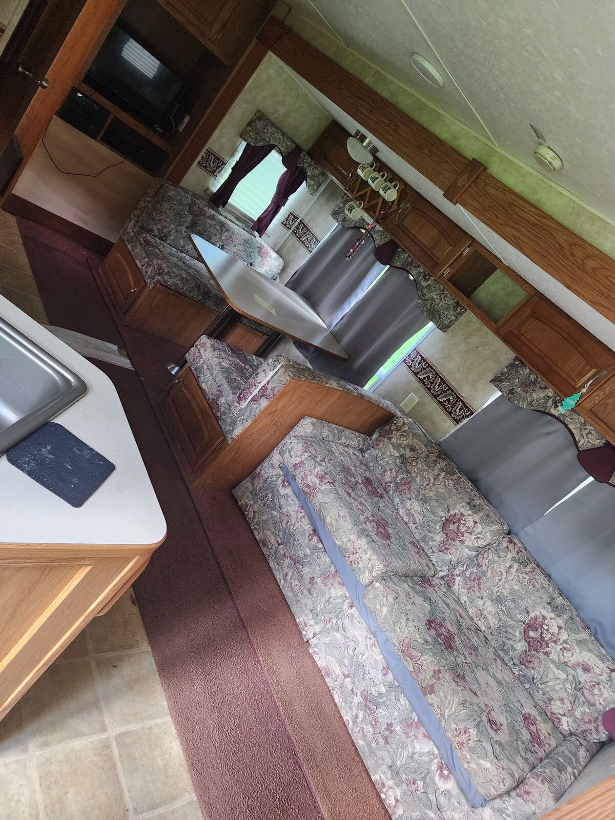 The top floor has a full kitchen, 1/2 bathroom, dining room & living room. The living room sofa has a pull out mattress and can sleep 2 people.