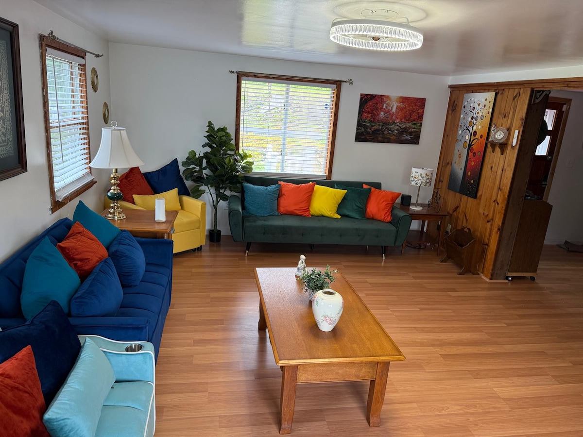 There are 3 bedrooms, (2 queens and 1 full) all equipped with closet space. Spacious living room with a television with Roku including Netflix and Hulu, sectional couch and extra large chair perfect for reading or working from home. Extra pillows, blankets and towels provided. Guests can enjoy a complimentary bottle of red or white wine from our favorite local winery, located on the bar cart in the living room upon arrival. We provide ground coffee, a coffee grinder and a variety of tea for guests to choose from located in the kitchen with a Ninja coffee system. Perfect getaway for a family, couple, or group of friends & we are dog friendly. Book your stay today!