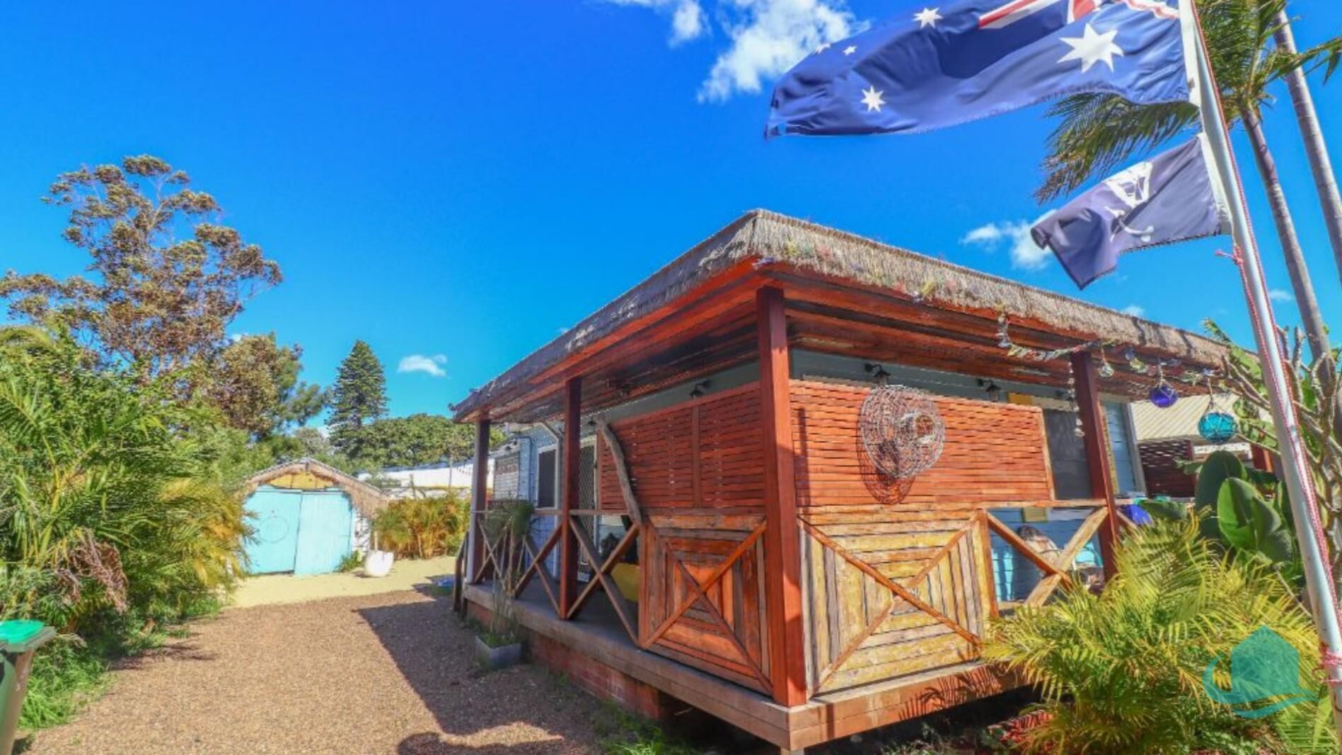 There is a large grassy backyard for all to enjoy, and a corrugated iron outdoor bar area, with historic relics.