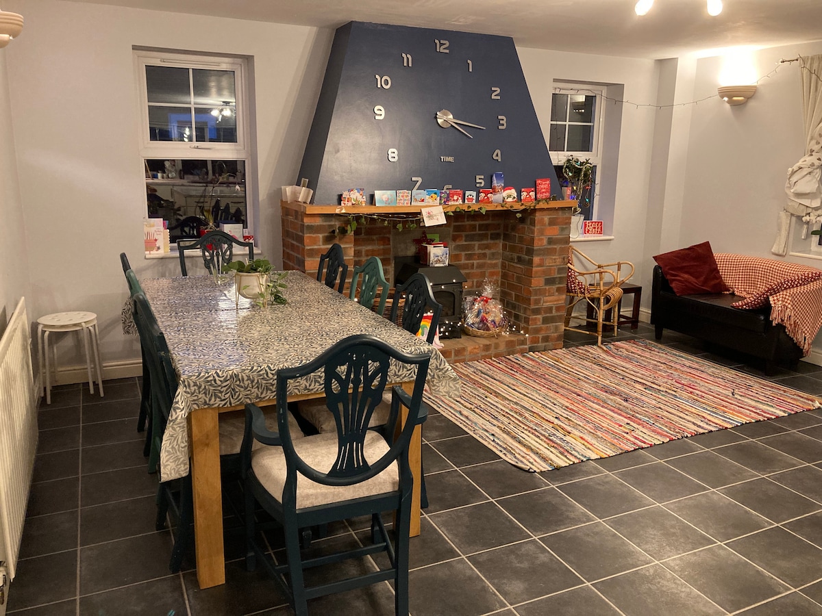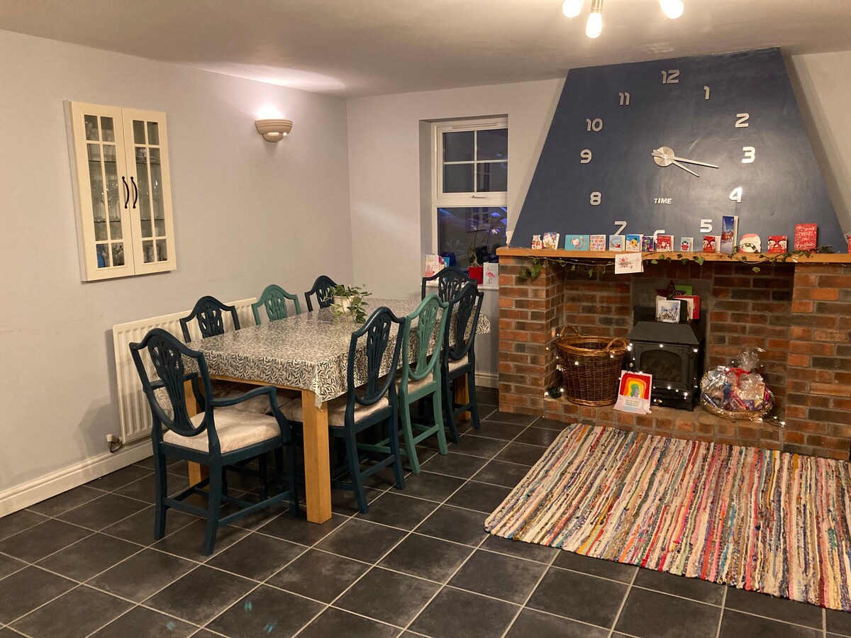 Lounge/dining room with WiFi router & access code, TV with freeview, DVD player, sofa bed & 2 armchairs. There is a fold away dining table with four chairs available.