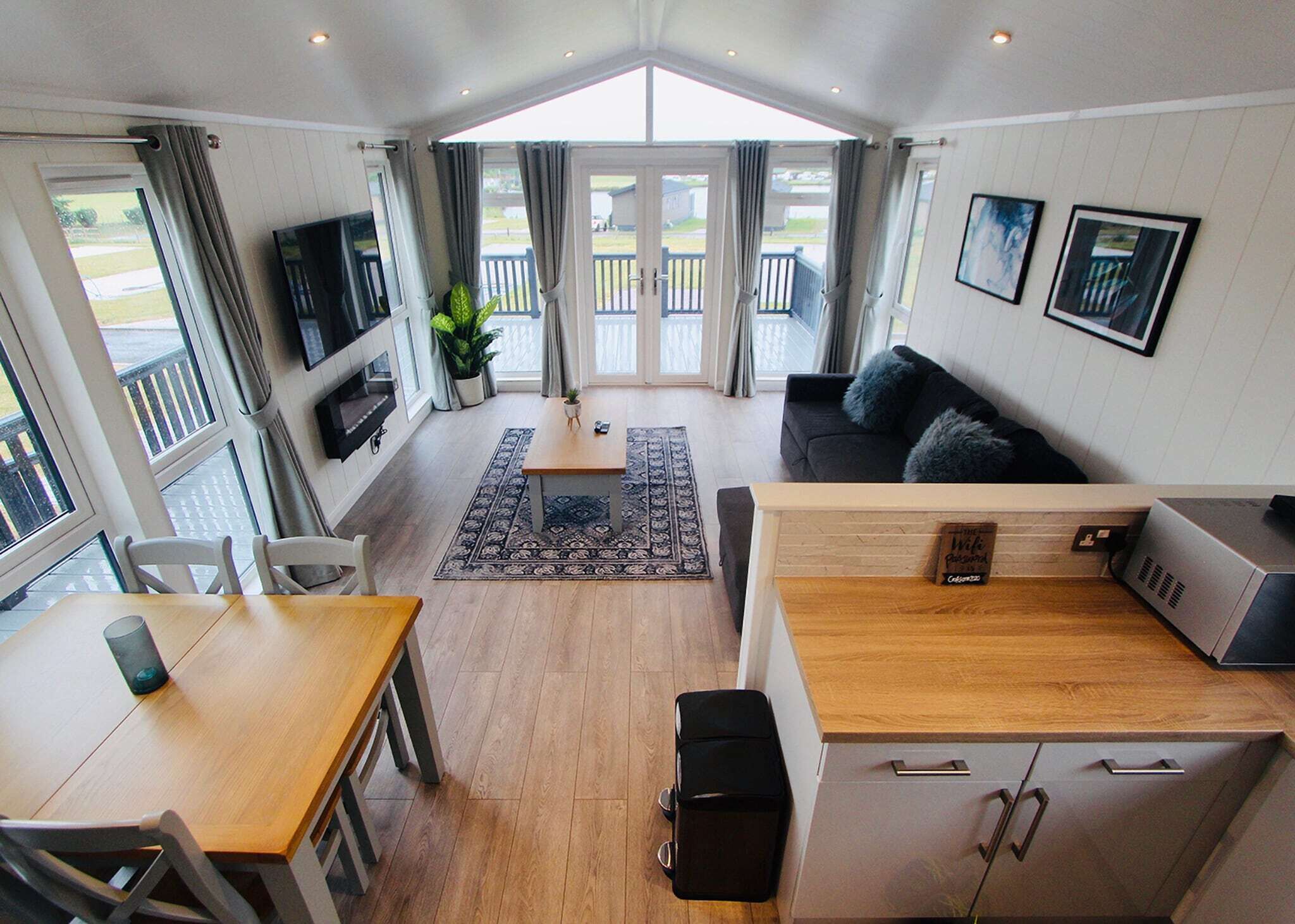 Spacious living area and open plan kitchen/diner lead up one step into the bedroom. The ensuite bathroom has a large shower enclosure.