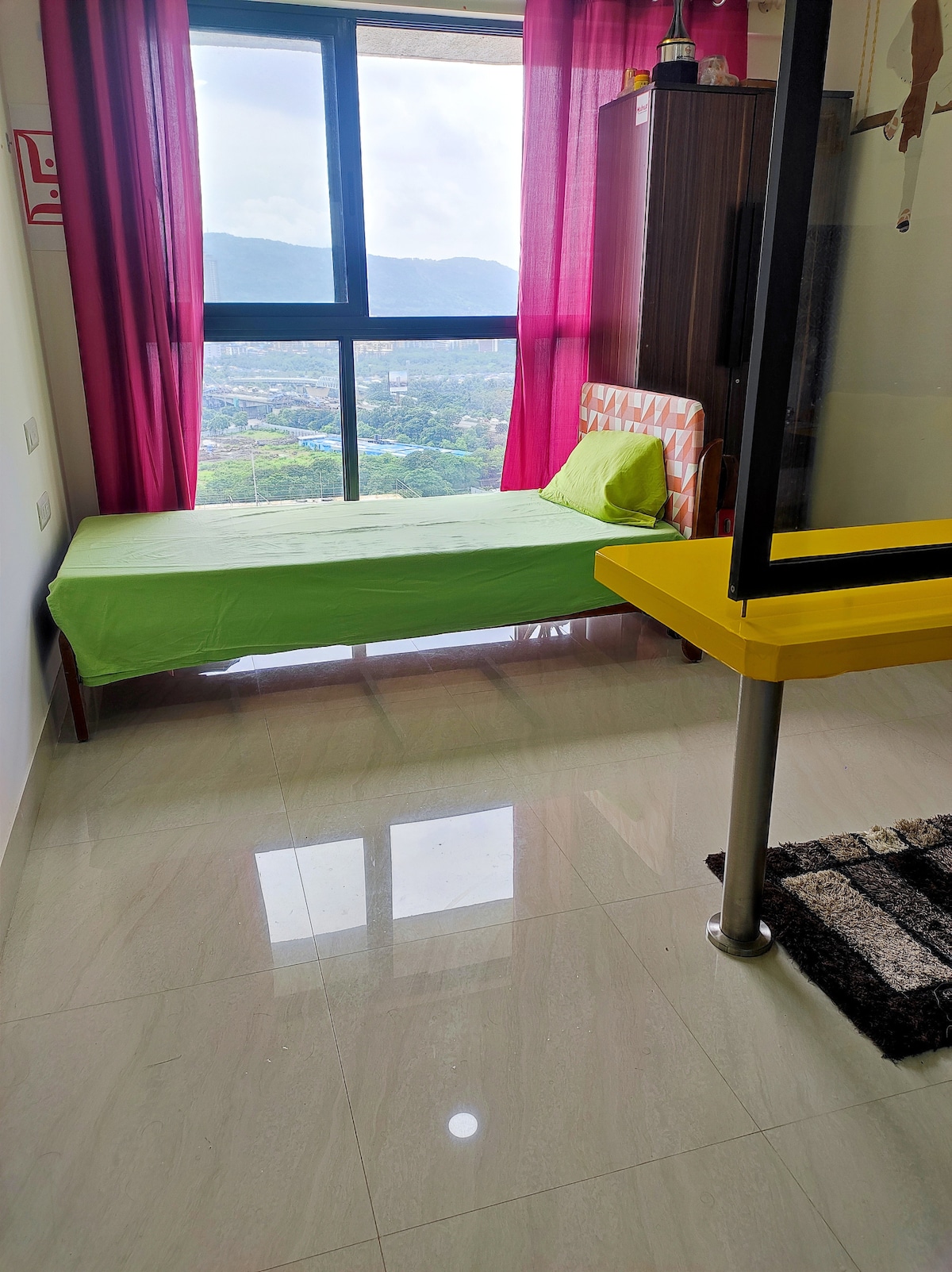 A private room with attached private bath, clean and spacious (without balcony ). A beautiful landscape view with big Room windows: Security Gated Tower with amenities Gym, Garden Area, CCTV. Good connectivity to Thane, powai and Andheri. Many eateries , cafes , restaurants, Supermarkt nearby. There is no Full Kitchen only a small gas for warming up food or making Tee , Fridge and washing machine available. :: Please note this may not be suitable for casual couples it's inside Society