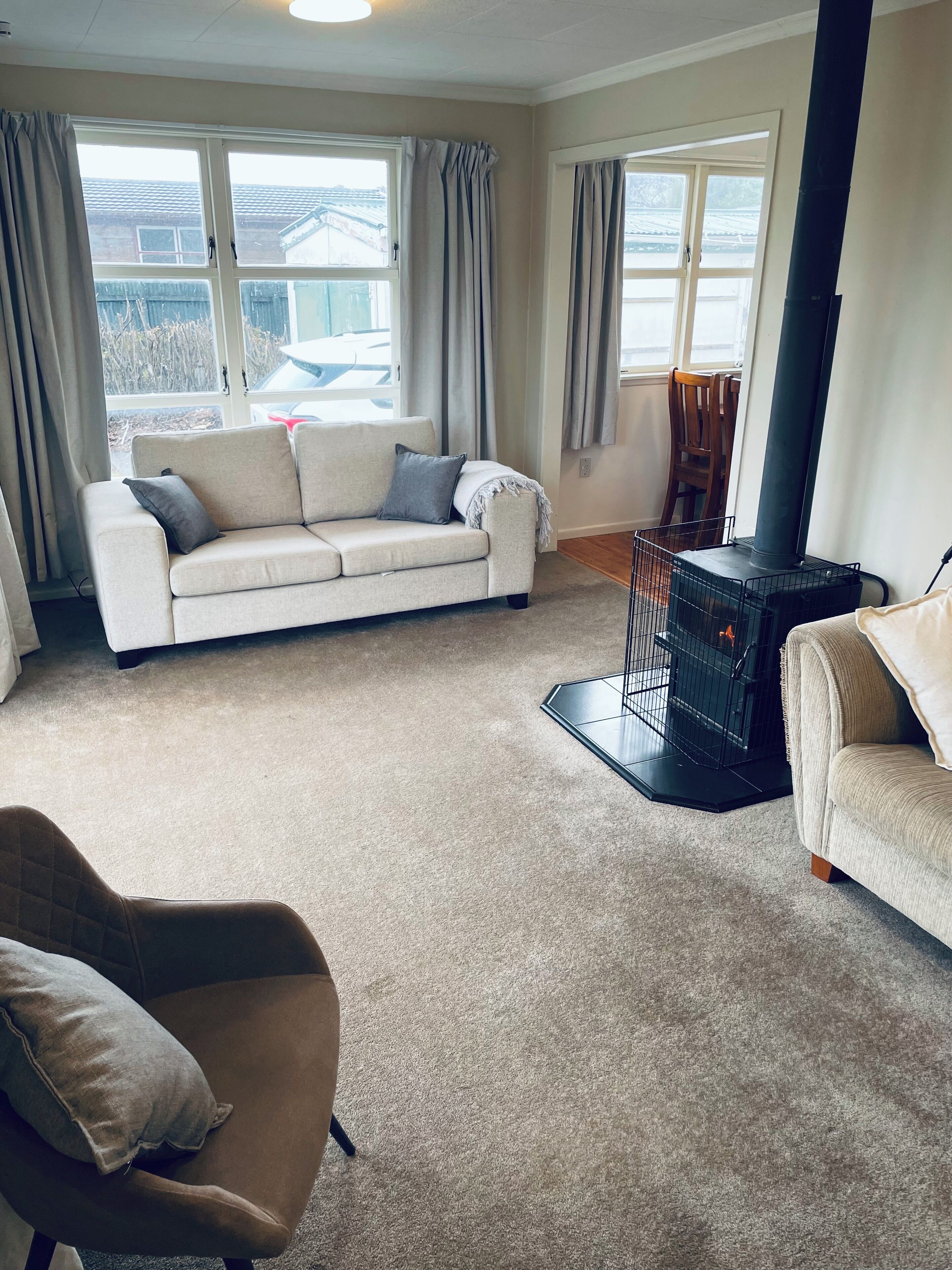 Cosy, well appointed 3 bedroom house with two lounge areas and modern kitchen. House gives you a log cabin feel with all natural timber inside and is kept warm by the log fire. A fully fenced property with a gate, so kids are safe.
