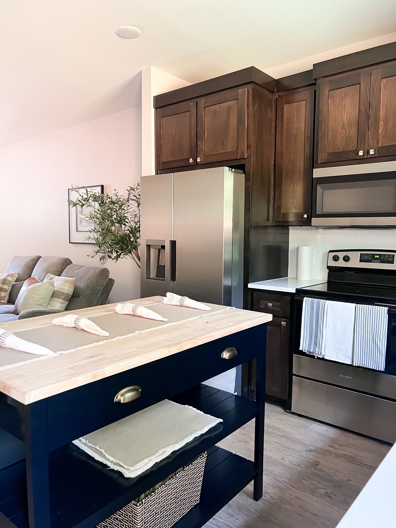 The kitchen is fully stocked with all the cookware, dishes, stainless steel appliances and a double oven. Coffee makers include a Keurig and drip coffee maker.