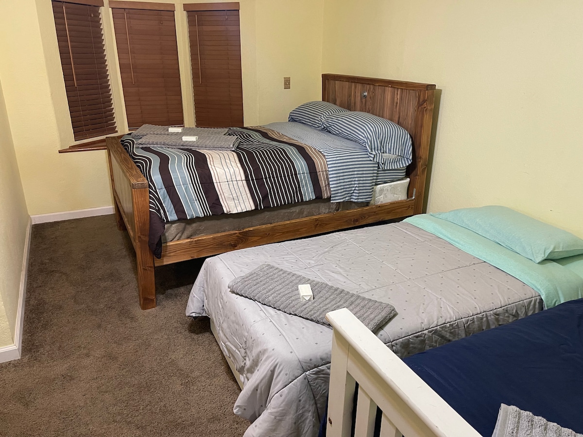 The other two bedrooms have a full-sized bed, closet/dresser space, ceiling fan, Smart TV, and dedicated workspace. These two rooms share a bathroom, which has a tub/shower combo.