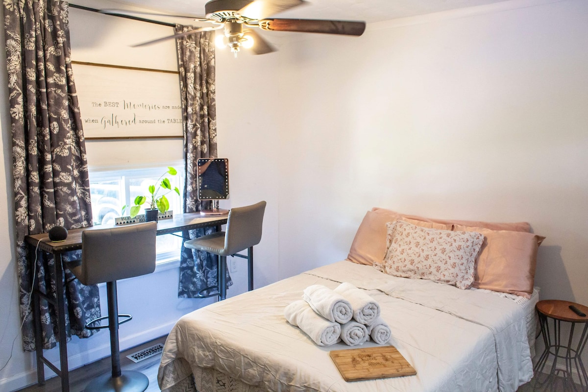The room has a TV, Roku, nightstand , ceiling fan, refrigerator, small freezer, Keurig with coffee pods, and a closet for your belongings. There is also a folding table that can be used for a work space etc.