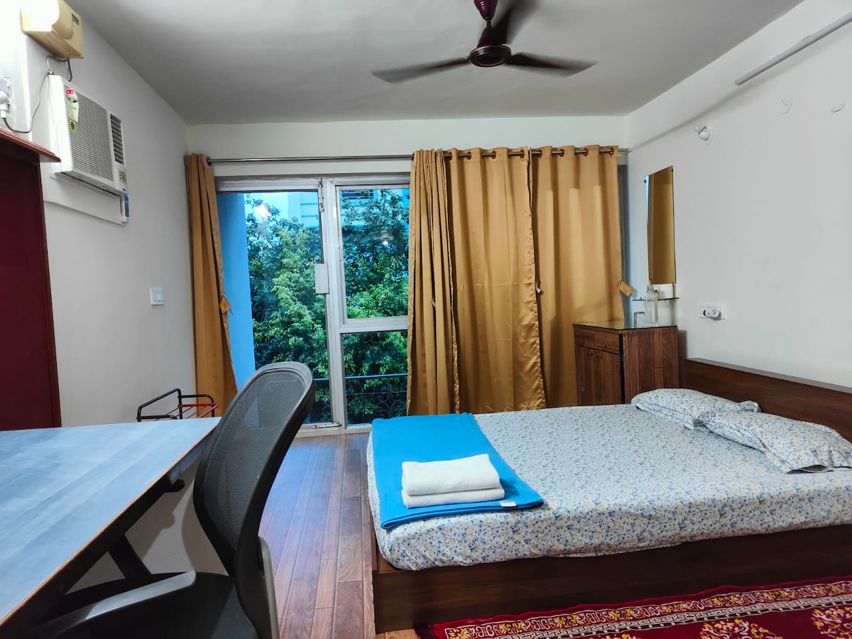Centrally located in a safe neighbourhood, a modern & spacious private room on the 1st floor of an independent house provides a perfect ambience for a cosy stay. Within walking distance to some of the finest Restaurants, Microbreweries, Shopping Malls, ATMs, Convenience Stores & Medical Stores. Ola/Uber wait time is less than 5 minutes on all days and at any time of the day.