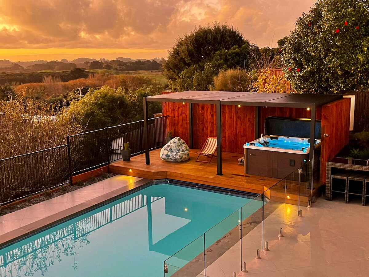 This big house really will accommodate large groups, without compromise. By day, soak up the sun on the beachfront decks and lawns. Play tennis or swim in the heated outdoor pool (12-September - 30 April), then enjoy a BBQ lunch at the long table in the courtyard. In the evening, enjoy a pre-dinner drink and watch the sunset from the mezzanine Kapiti room, then share dinner with friends or family around the huge dining table at the heart of the house. Relax in the spacious lounge with Sky TV, or watch the night sky from the big spa pool. In the morning, breakfast in the kitchen diner with wood burner or on the sunny decks, then step onto the beach to swim, walk, play or relax.