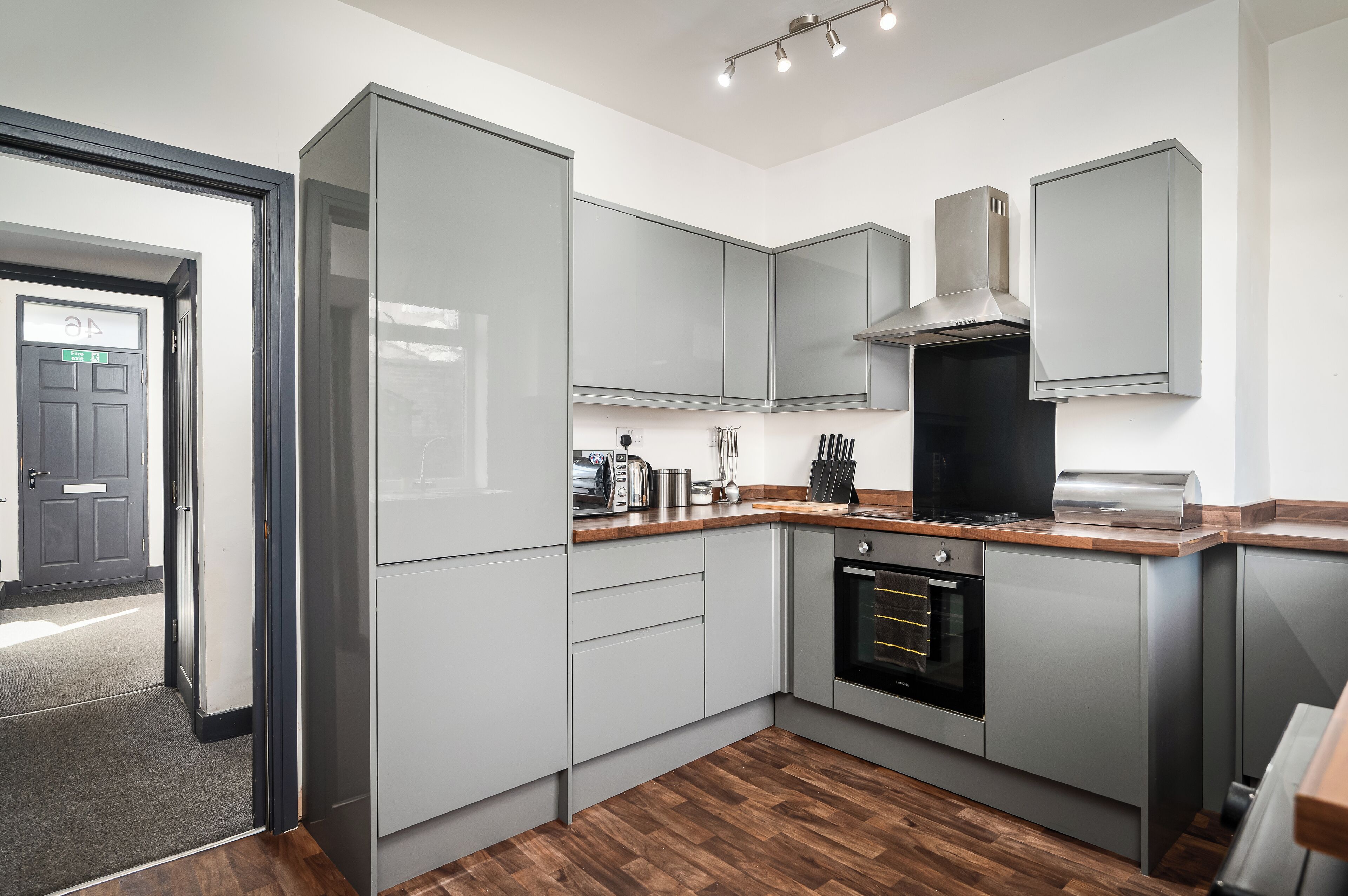 Downstairs, the well-equipped kitchen is large enough for dining in, complete with all the cooking essentials. Guests are kindly asked to clean up after use.