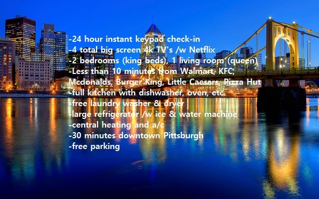 This 2 bedroom home sits on a friendly residential street in Weirton and is equipped with everything you need for your stay. Comfortable beds and pillows with quality linens, a coffee bar, and smart TVs and wi-fi. You’ll feel right at home in this clean & comfortable space!