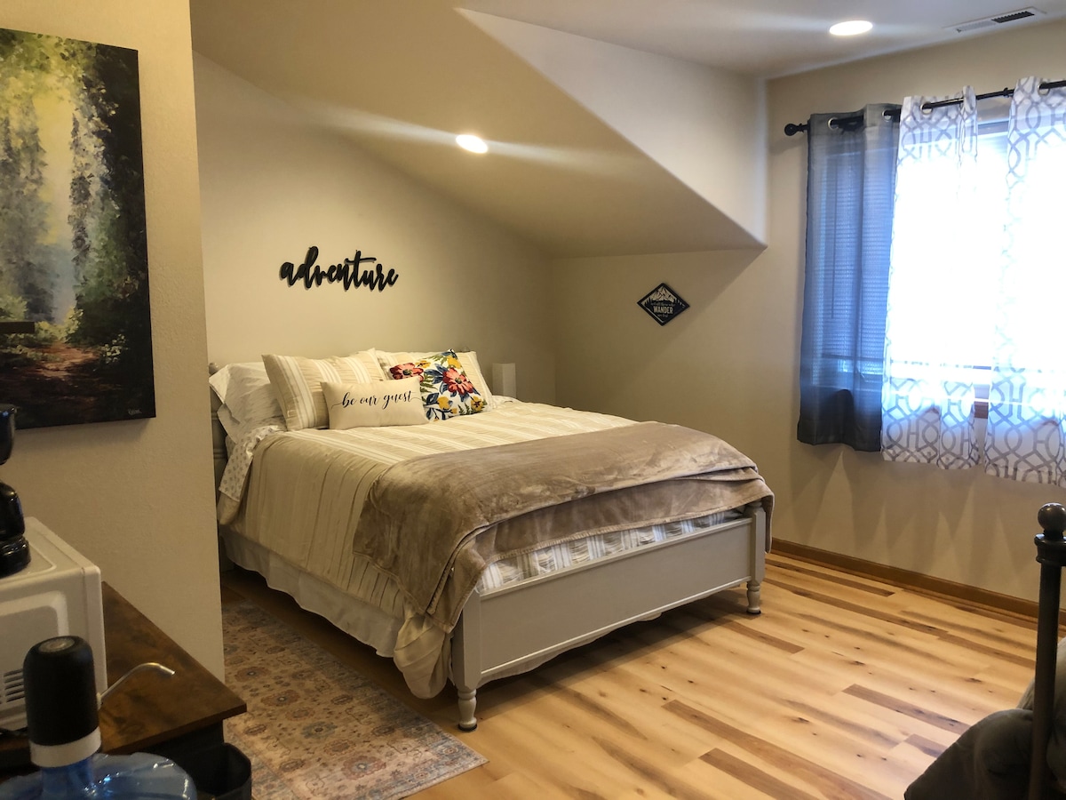 The Trail room at Tipsy Brush comfortably sleeps 4 people, with a comfy queen bed and trundle bed with two twin mattresses! The building is owner occupied and guests have a dedicated bathroom plus access to 24 hours of free laundry. Our rooms are upstairs, above Tipsy Brush Studio. If you would like, enjoy sip and paint downstairs for a fun date night, then a restful night upstairs! Located right on the highway just 8 minutes from Kalispell! Rails to Trails bike path access from our parking lot!