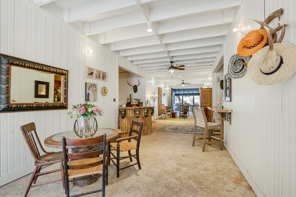 Step outside to your private patio, equipped with lounge chairs and an outdoor dining set. Enjoy unobstructed views of the picturesque landscape, relax by the fire ring with seating, and benefit from dedicated parking for up to two cars. Explore the shared amenities exclusive to guests at Wild Candy Farm, including a peaceful wet weather creek, “Holy Rock Lake” with a dock and seating, and hiking on the scenic “Dry Cypress Trail.”