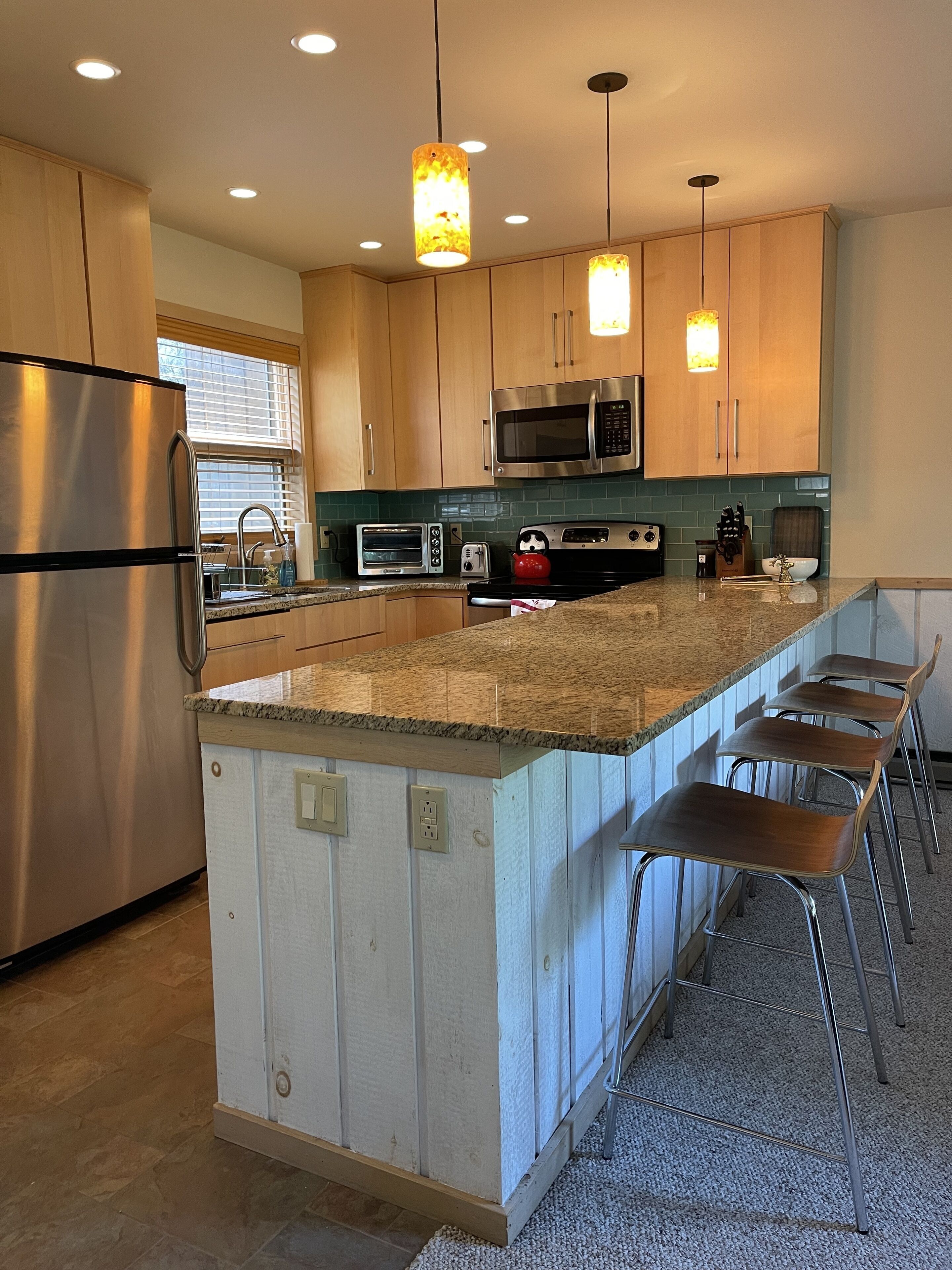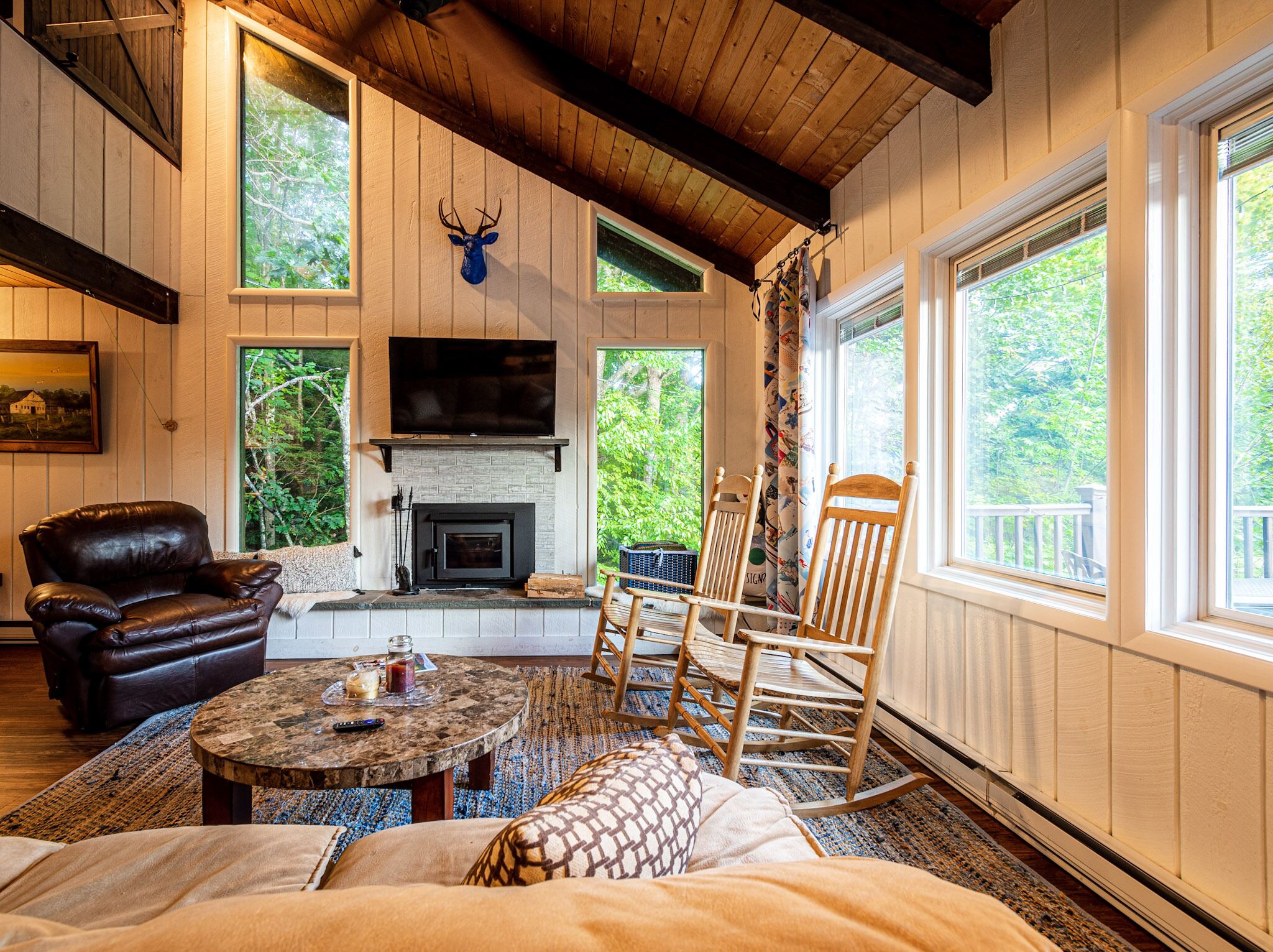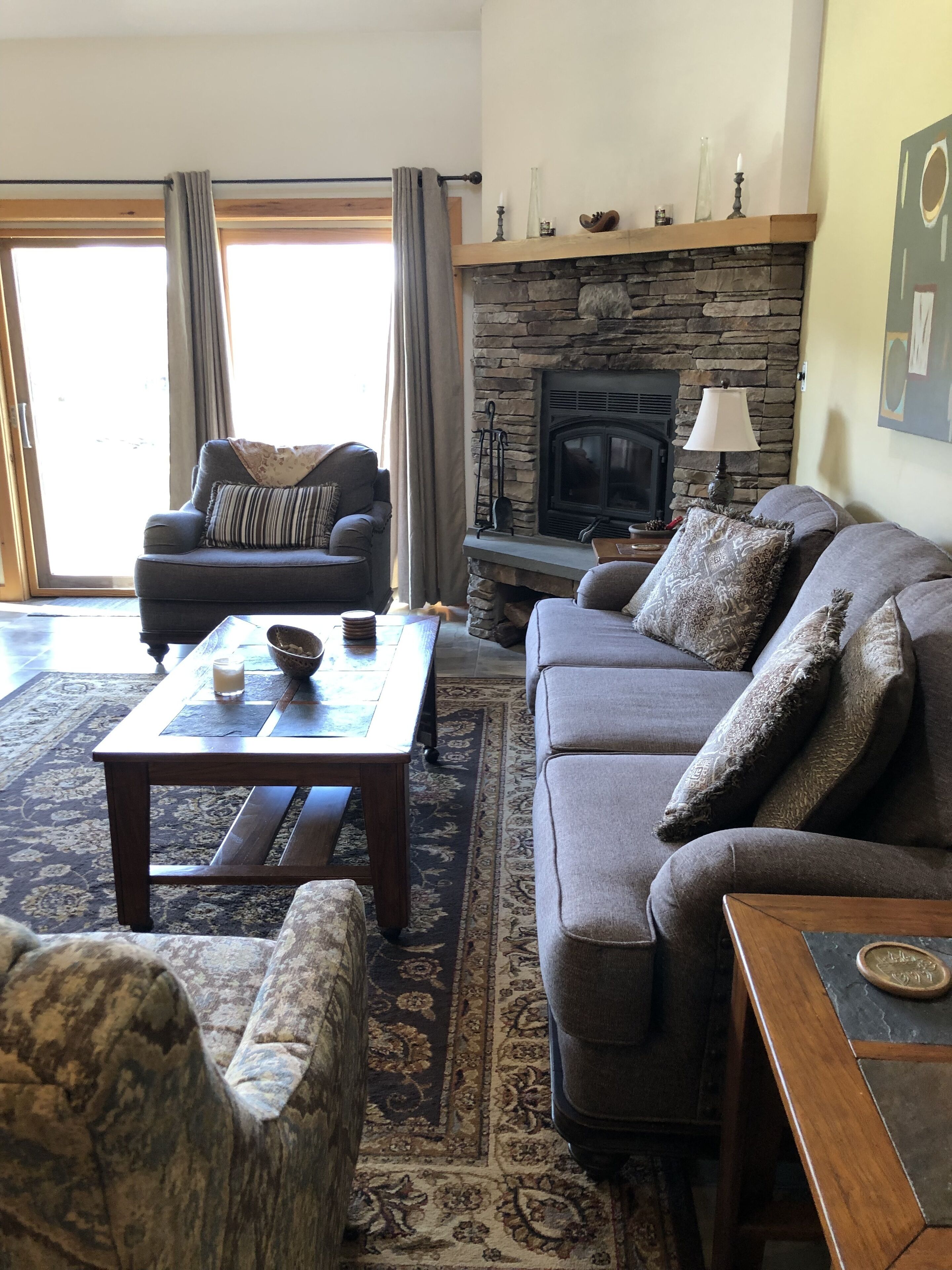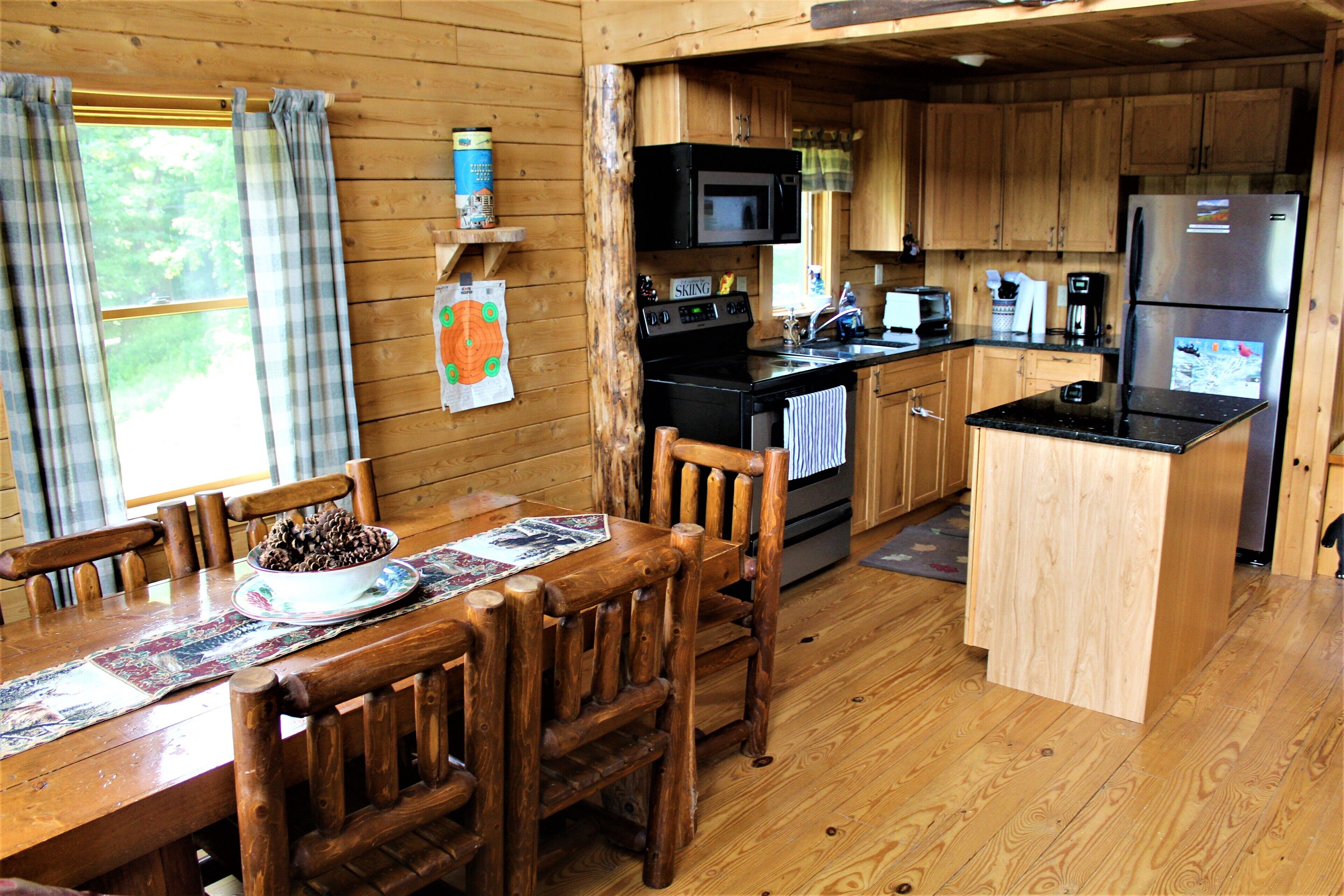 Relax in our living room on the new comfy couch which faces the wood-burning fireplace. The living room also features a flat screen TV with Roku. High speed WiFi perfect for remote work. A variety of favorite board games for you and yours to enjoy. A roaring fire will keep you warm even on the coldest nights.