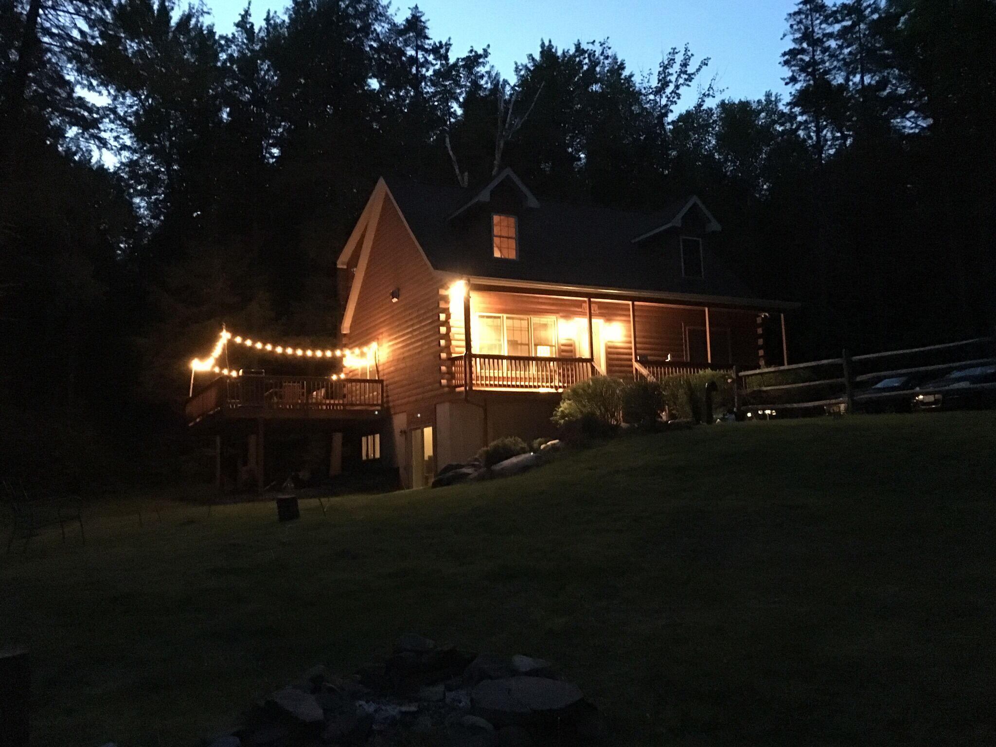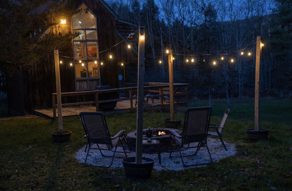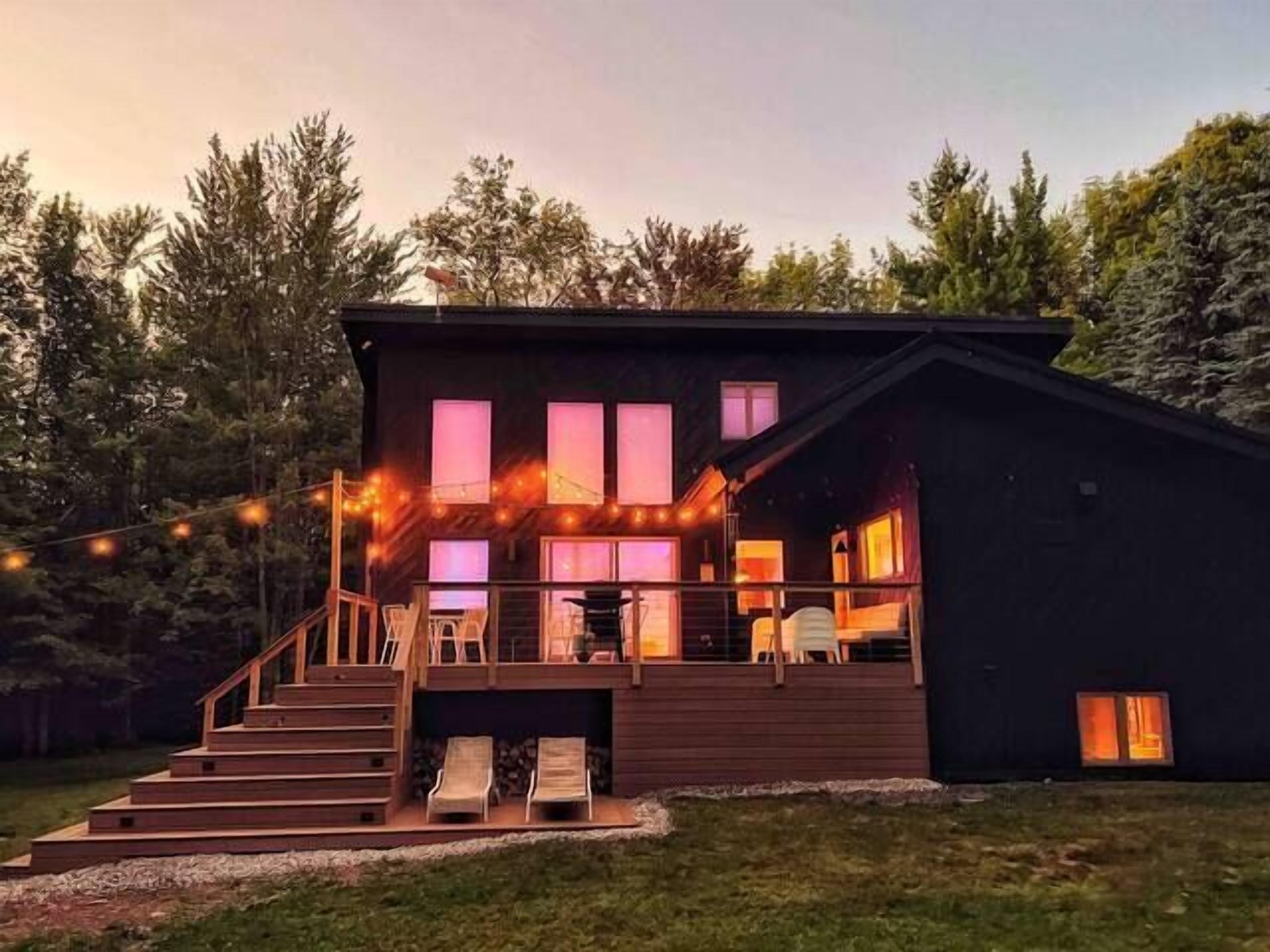 At night time, relax and star gaze from the deck. Our unique chalet comes an outdoor with fire pit, 8 outdoor chairs, string lights over the deck and a propane BBQ grill. Propane for the grill and complimentary firewood are included with your stay it is a large fire pit on the grounds which is our favorite way to end the day.