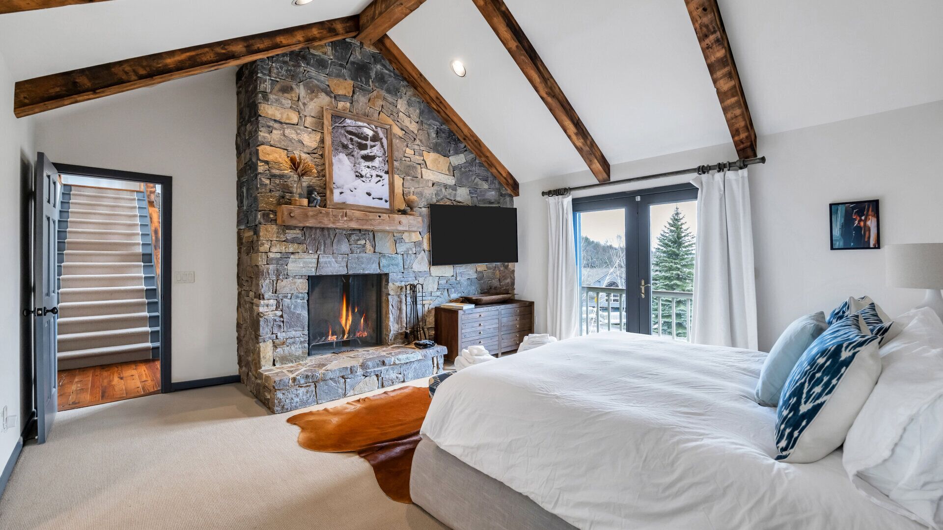 From the spacious deck, as you step inside, you'll be greeted by double-height ceilings that lend an airy and open feel to the space. With a spacious deck, this chalet is tailor-made for entertaining and enjoying crisp mountain air..