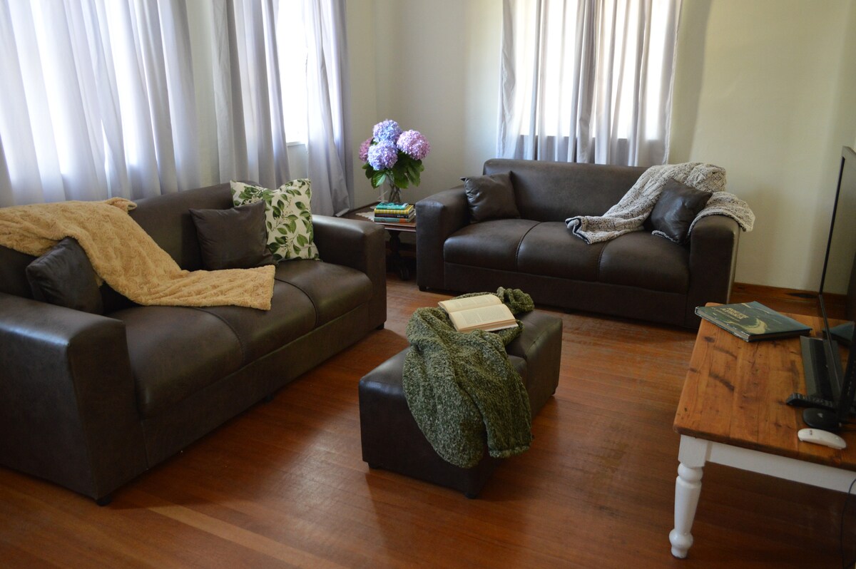 We offer guests the best of indoor-outdoor living with a fully equipped kitchen, covered built in braai and large fold back doors lead onto a covered wrap-around terrace. Lazy days can be enjoyed on the terrace, out on the lawn or curled up on the couch in the lounge. On winter days set the fireplace alight, and settle in for the big 'chill'.
