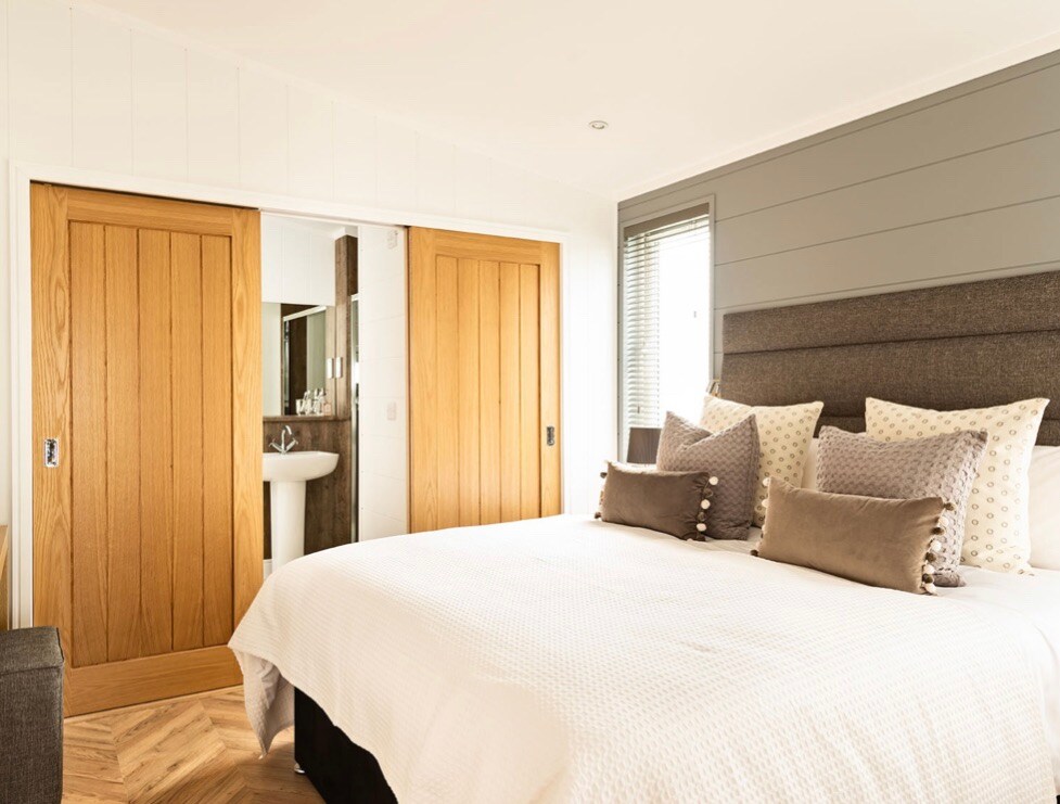 The outdoor space is designed to ensure you can enjoy the sunshine from dusk til dawn. With a built-in BBQ and a large seating area overlooking the lake, perfect for long summer evenings with a glass in hand. The hot tub is lowered into the decking so you can make the most of the idyllic woodland surroundings.