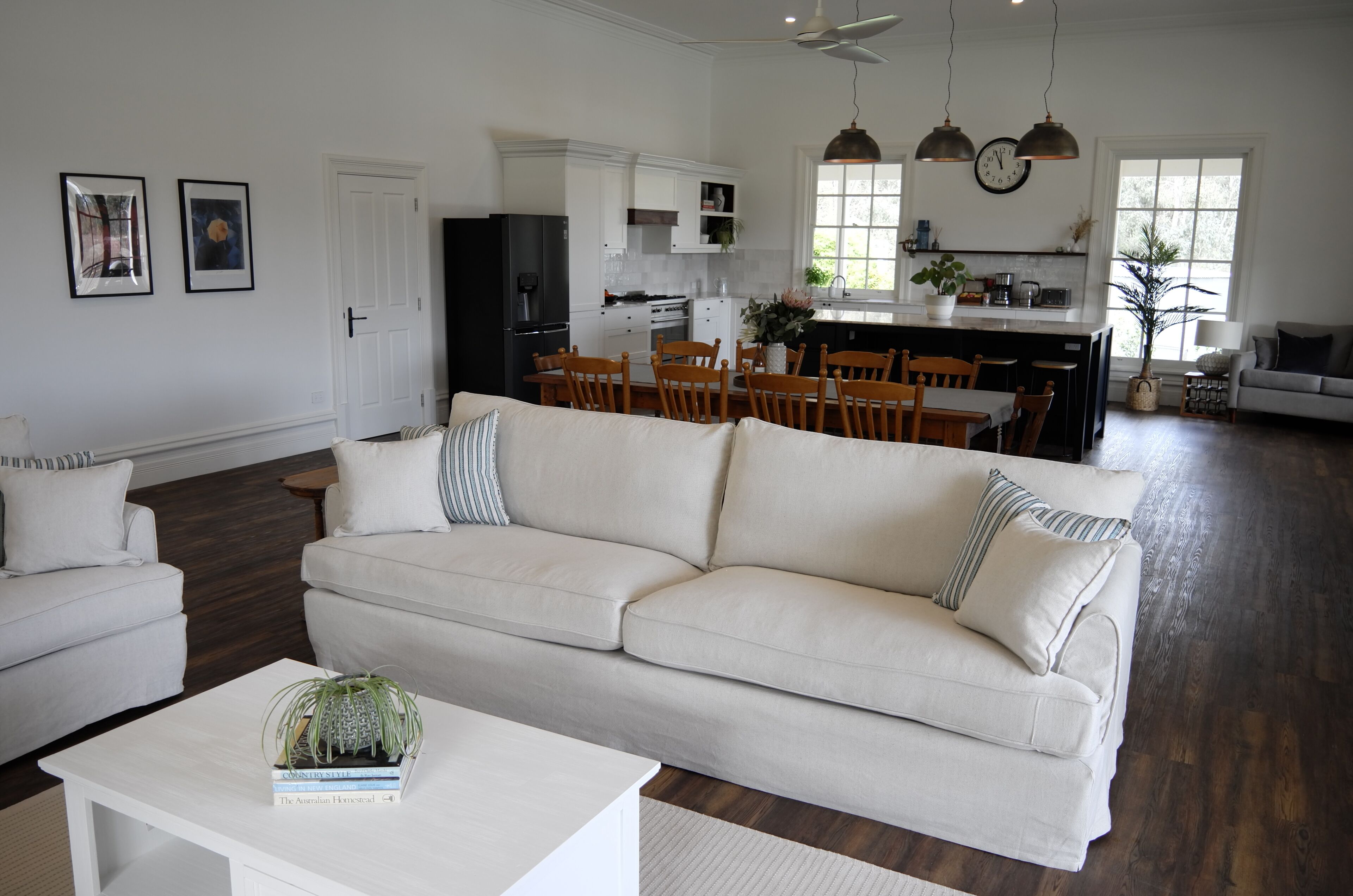 The main house has four bedrooms and two bathrooms. The centerpiece is the open plan living, dining, kitchen area. Spacious and beautifully appointed featuring a living area with TV, DVD and Bose entertainment system, eco fire open fireplace, expansive dining table and fully equipped kitchen with a chefs stove and double oven. Wide sliding doors open onto a large alfresco deck with an electrolux BBQ, perfect for relaxing and entertaining.