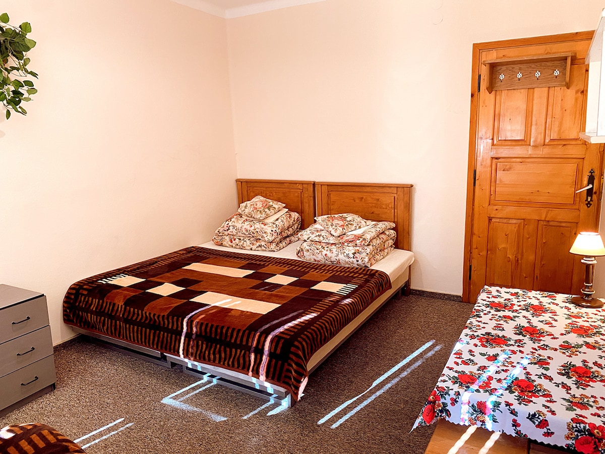 We cordially invite you to a 2-person room "Tibet". Why is this name? "Tibet" is the term used in Podhale to describe the material from which the quaint highlander skirts travel! Here, for guests, a typo and a pillow, + colorful, highlander paintings painted on glass.