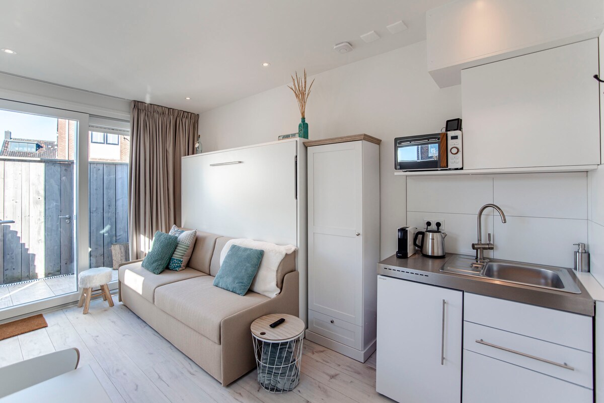 This newly built studio for 2 is the perfect base for your trip to Zandvoort. The cosy place features a living room with sofa bed, a bathroom with walk-in rainshower and a kitchenette with microwave, egg cooker, Nespresso coffee maker and kettle. The sofabed transforms easily from a closet and couch combination to a comfortable double bed. And not to forget a private terrace where you can enjoy the sunlight in peace.