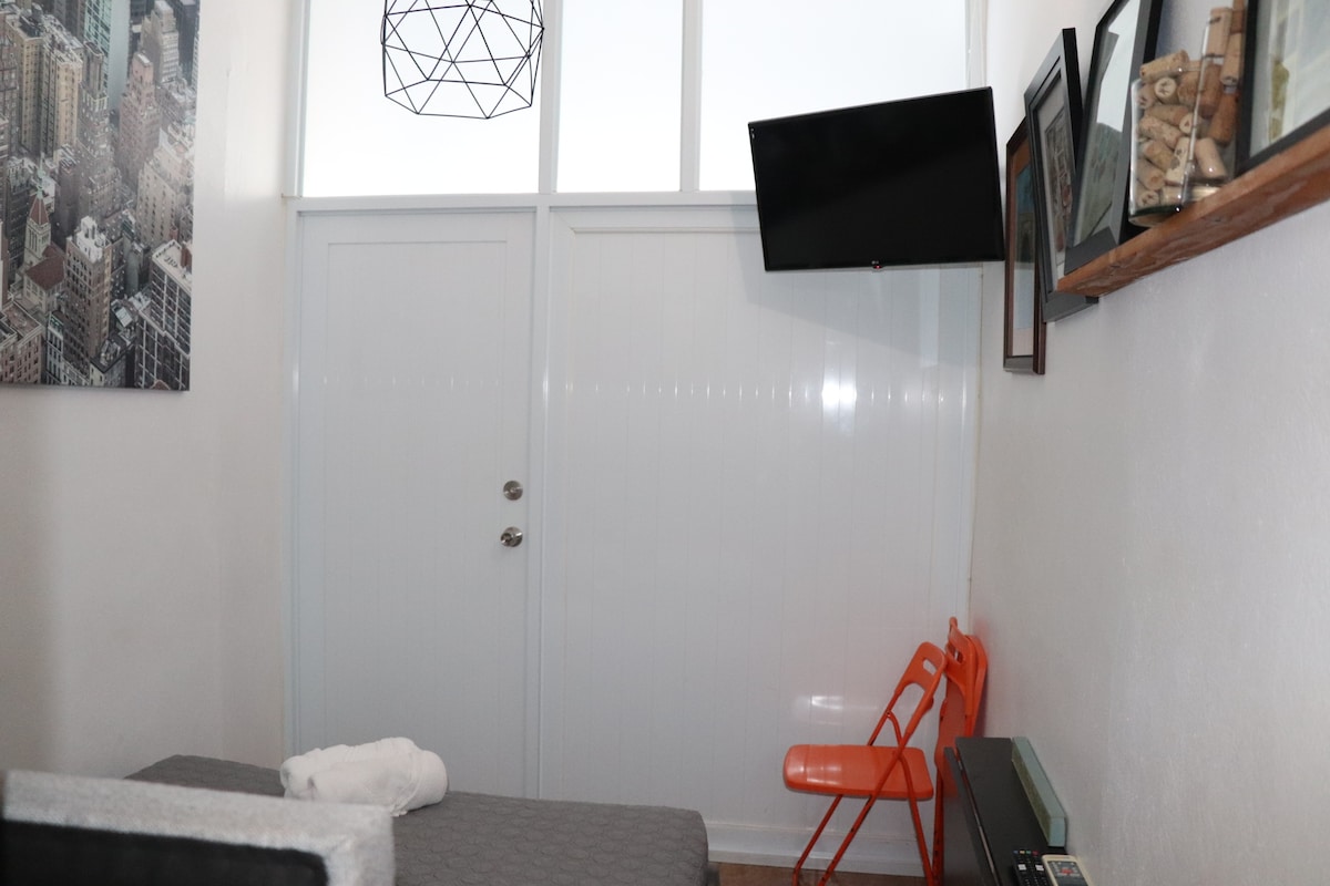 This is the biggest room of the house. It has one bed and a futon. it fits 3 persons. air conditioning. one share bathroom. one ceiling fan. one desk. a very big closet and the plus is the private balcony whit a great view.