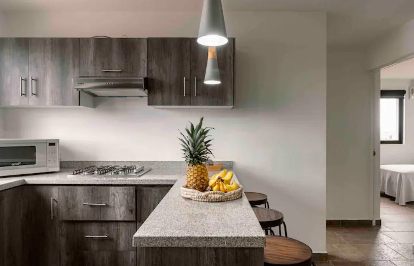 Apartments for pleasant stays of up to 4 people equipped with kitchen, dining room or bar and two comfortable rooms with closet, tv and air conditioner. 24 hour surveillance and common areas such as sports court and event palapa.