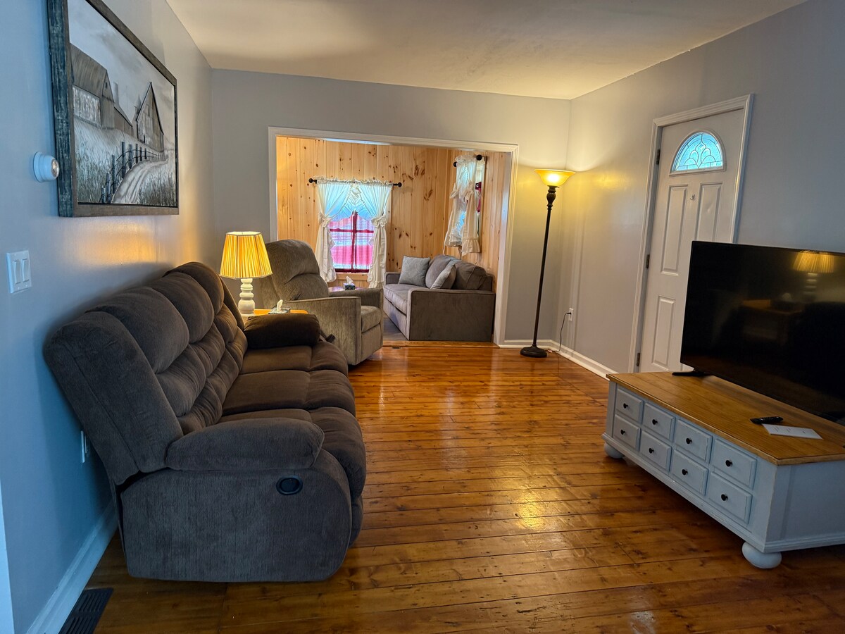 The fully equipped kitchen features new appliances and all the essentials for cooking meals. The living area is spacious and bright, with cozy sofas and a big Roku TV – perfect for movie nights. High-speed Wi-Fi and a convenient dining/work table make this home suitable for remote work or planning your adventures. Each bedroom is freshly updated: two rooms have queen beds and the third is a fun bunkroom (twin over full bunk bed) ideal for kids or extra guests. The spacious living room is equipped with a futon, and the bonus room has a desk for a dedicated work space as well as a futon to serve as a 4th bedroom. We even provide a starter supply of coffee/tea and local guides to enhance your stay. Our home can host up to 9 guests comfortably, making it great for families and groups. Parking is easy with your own driveway and we’re just a short stroll from scenic parks. Why You’ll Love It: You can walk to everything – charming James Street is a 5-minute walk, where you can dine, shop, or hop on a boat to Boldt Castle. After sightseeing, come home to relax on the porch or play board games in the living room. We’ve outfitted the home with extras like air conditioning, a washer/dryer, and a grill on the porch for summer cookouts. Our goal is to make you feel at home in the Thousand Islands! Come enjoy Alexandria Bay in style – whether you’re here for a family vacation, couples’ getaway, or remote-work change of scenery, this downtown renovated retreat offers the perfect blend of location, comfort, and local experience. We look forward to hosting you!
