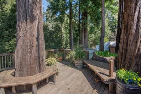 This tall ceiling room is located closest to the parking portion of our property with easy walking access. There is a redwood grove and deck nearby for yoga and meditation.