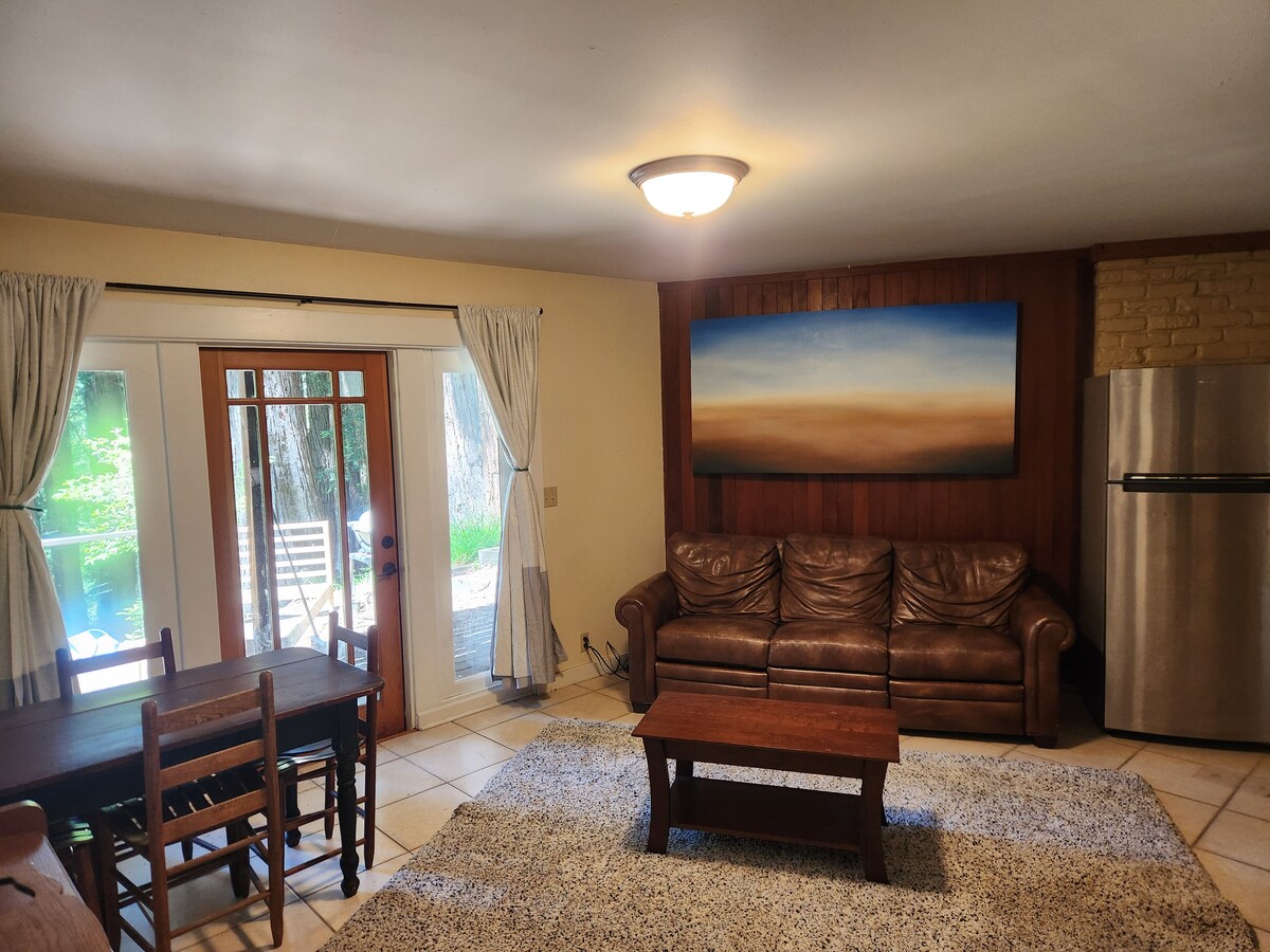 1 bedroom, 1 bath studio unit in a beautiful A-Frame in the trees of Aptos, CA (Permit 221336). This is the lower of two units in the house and features an efficiency kitchen, a full bathroom, a private deck, bedroom, and living room area.