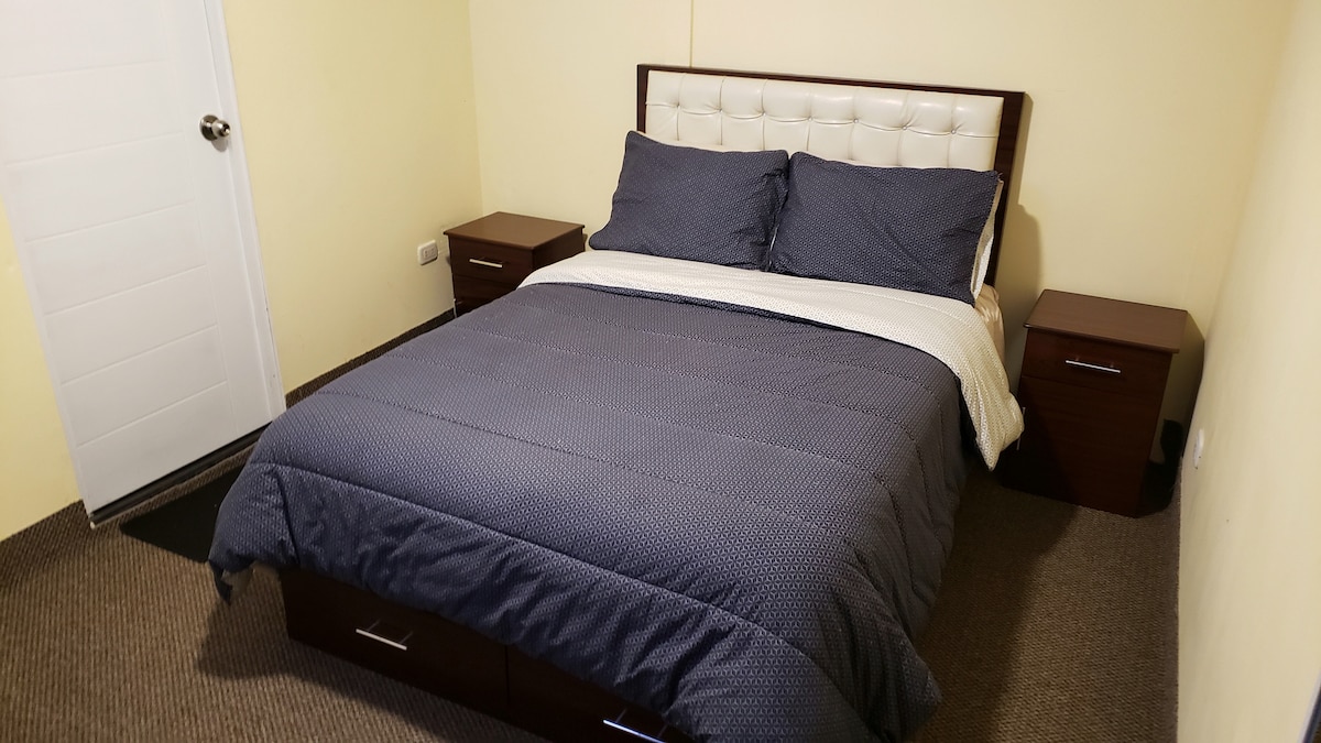 Our private room is located on the 1st floor, it has a double bed (very soft high-end), a wardrobe, a 49-inch Smart TV, a small table with two chairs, inside the room there is a private bathroom with hot water (we do not include personal toiletries such as soap, shampoo and toilet paper), in addition to that you can use a well-equipped kitchen (shared area). The guest is given their own key to their room and to the front door of the street there are no restrictions on check-out or check-in time.