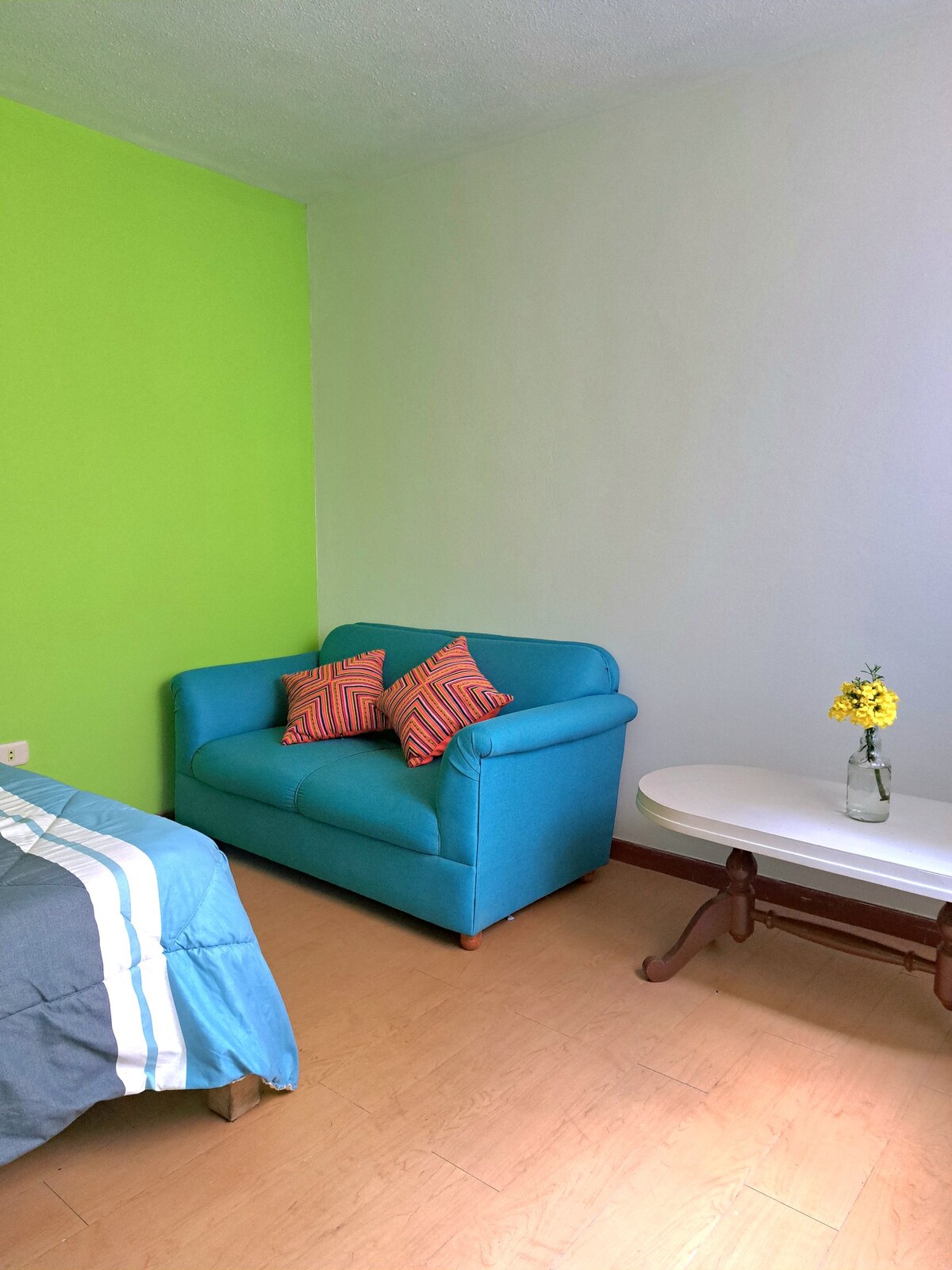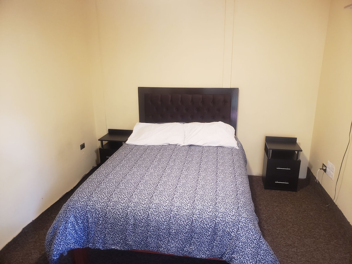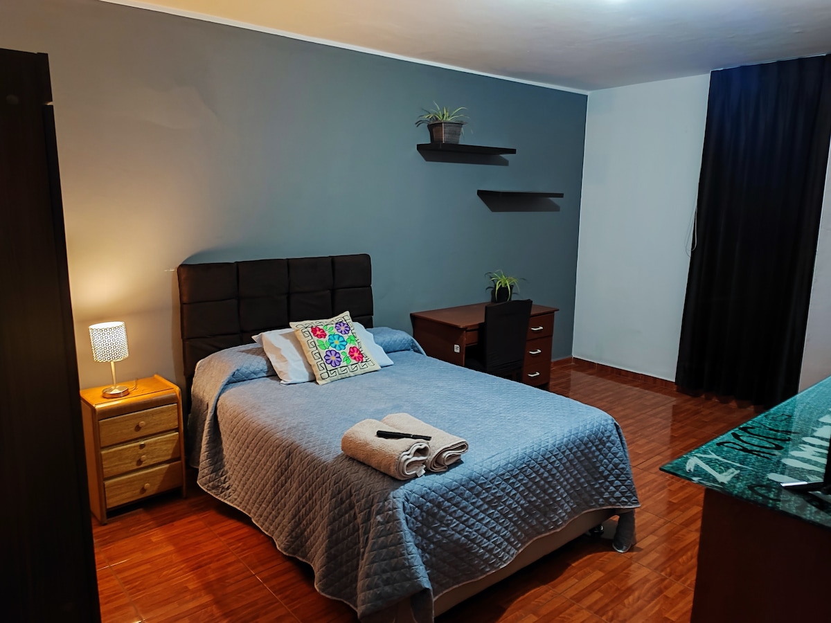 Our Private room is located on the 2nd floor, it has a double bed (very soft high-end), a closet, two candles , a 49-inch Smart TV, a small table with two chairs, inside the room there is a private bathroom with hot water (we do not include personal toiletries such as soap , shampoo and toilet paper) , in addition you can use a well-equipped kitchen (shared area). The guest is given their own key to their room and to the front door of the street there are no restrictions on check-out or check-in time.