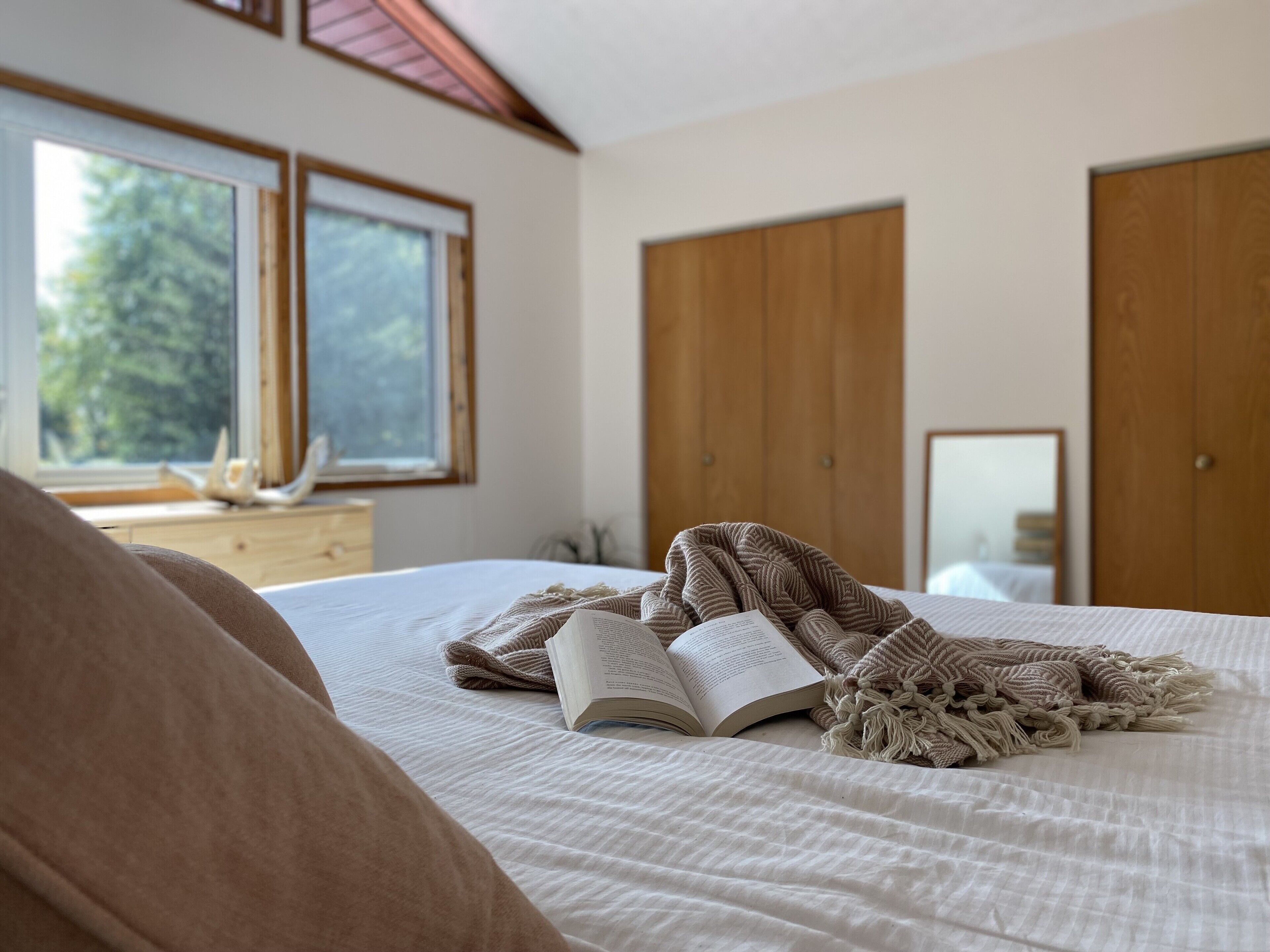 The cozy cabin is the perfect escape for couples or a small family. Sleeps four comfortable with the option of adding two other guests with a roll out under bed mattress. On the main level is a private bedroom with queen sized bed, dresser and closet. On the second level is an additional bedroom with a queen sized bed. All linens and towels are complimentary during your stay.