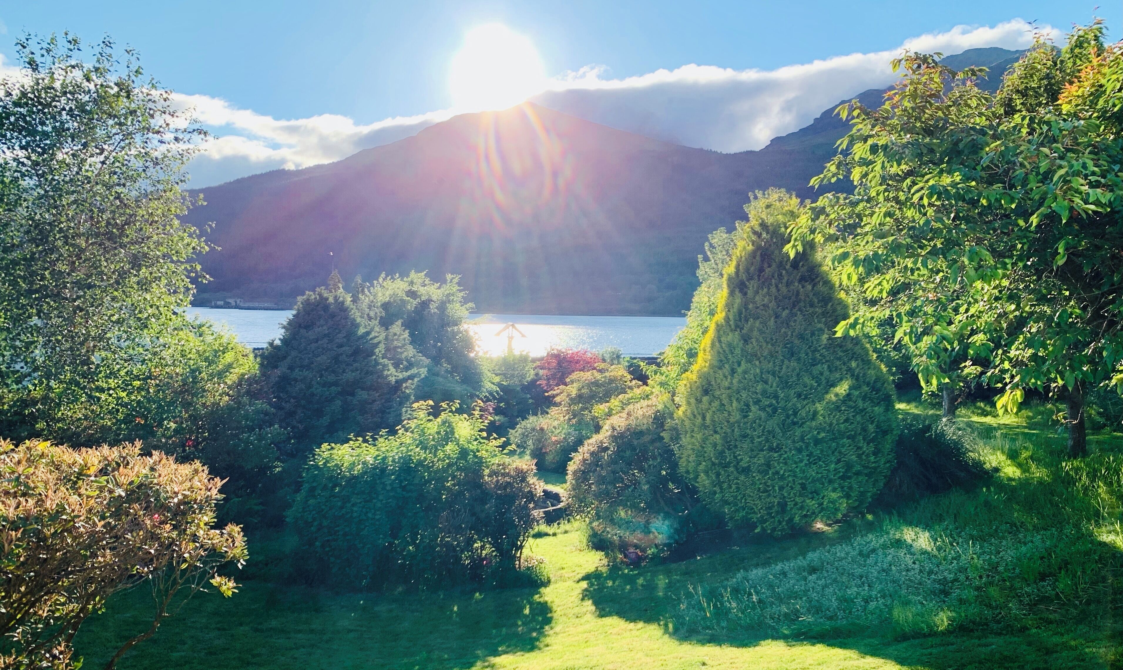 The bedroom with a super king or twins, take your choice. There’s also a sitting room, and both rooms have TVs. There’s a lovely en-suite with shower. Two windows overlook Loch Long, Ben Arthur (the Cobbler) and our two acres of lush gardens. There’s two drawing rooms that are shared spaces, and breakfast buffet room, and plenty of outdoor seating space.