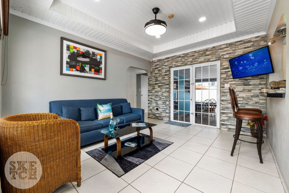 Back studio apartment, ideal for a couple or individual seeking relaxation. Conveniently located: a 5-minute car ride from the airport, 10 to 15 minutes walking distance to the bus stop, and 20 to 30 minutes walking distance to Surfside Beach and local bars. Just a 15-minute drive to Oranjestad.